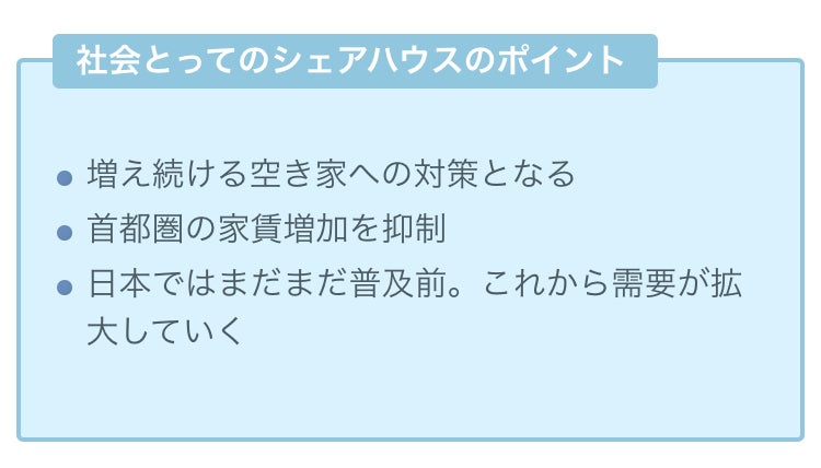 シェアハウスには、上がりすぎている首都圏の家賃を抑制できるという社会的な側面があります。