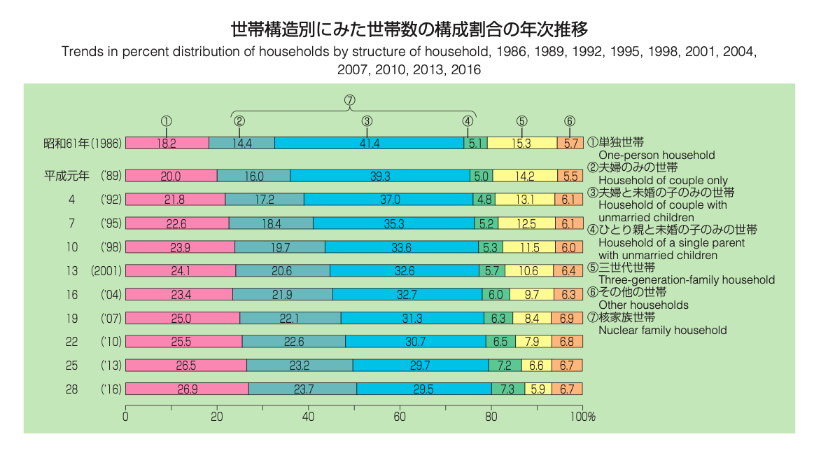 黄色で記された「三世代世帯」が年々減っている