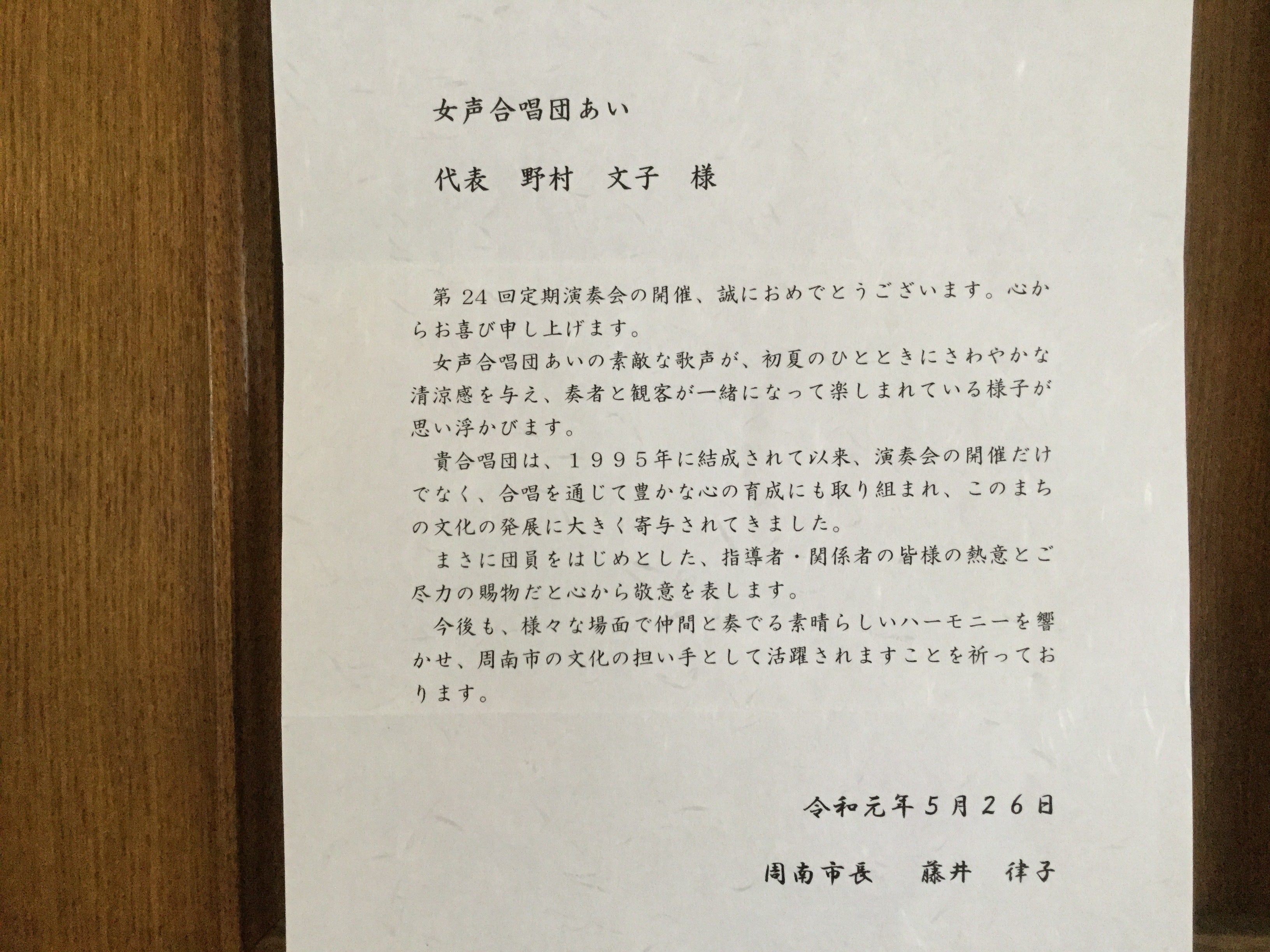 前回のコンサートに、周南市長から下記のお祝いメッセージを頂きました‼️
