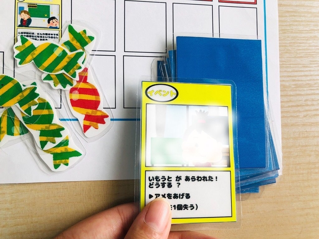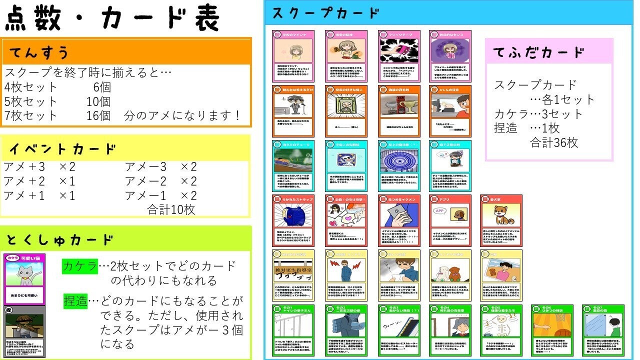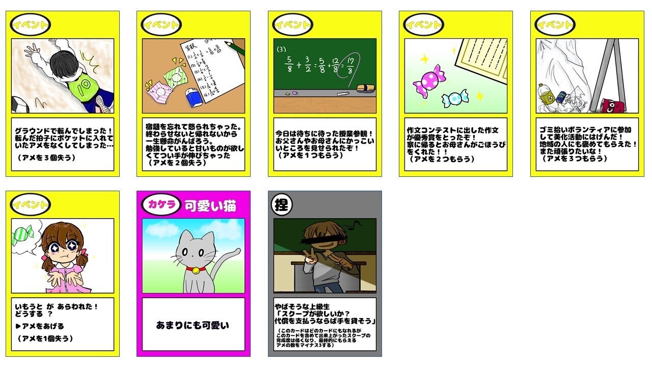 ○捏造カード:足りないカード1枚の代わりになる。しかしこのカードを使用してセットを完成させた場合、セットで得られるアメの数が3つ減る。