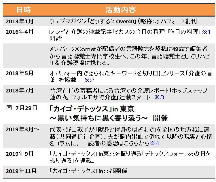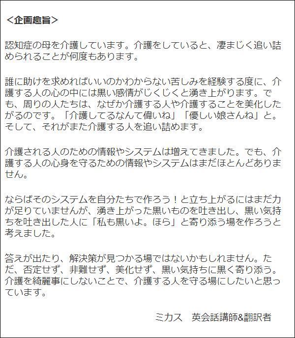 当該プロジェクトを運営するのは、ウェブマガジンの代表でもある野田敦子(ウェブネーム:カリーナ)とメンバー3名です。野田は、昨年9月以来、脳内出血で倒れて遷延性意識障害(植物状態)と確定診断された配偶者を看る立場にあり、他メンバーも、それぞれ肉親の介護を現在進行形で担ったり、言語聴覚士として介護現場に携わっていたりと、全員が「介護当事者」です。