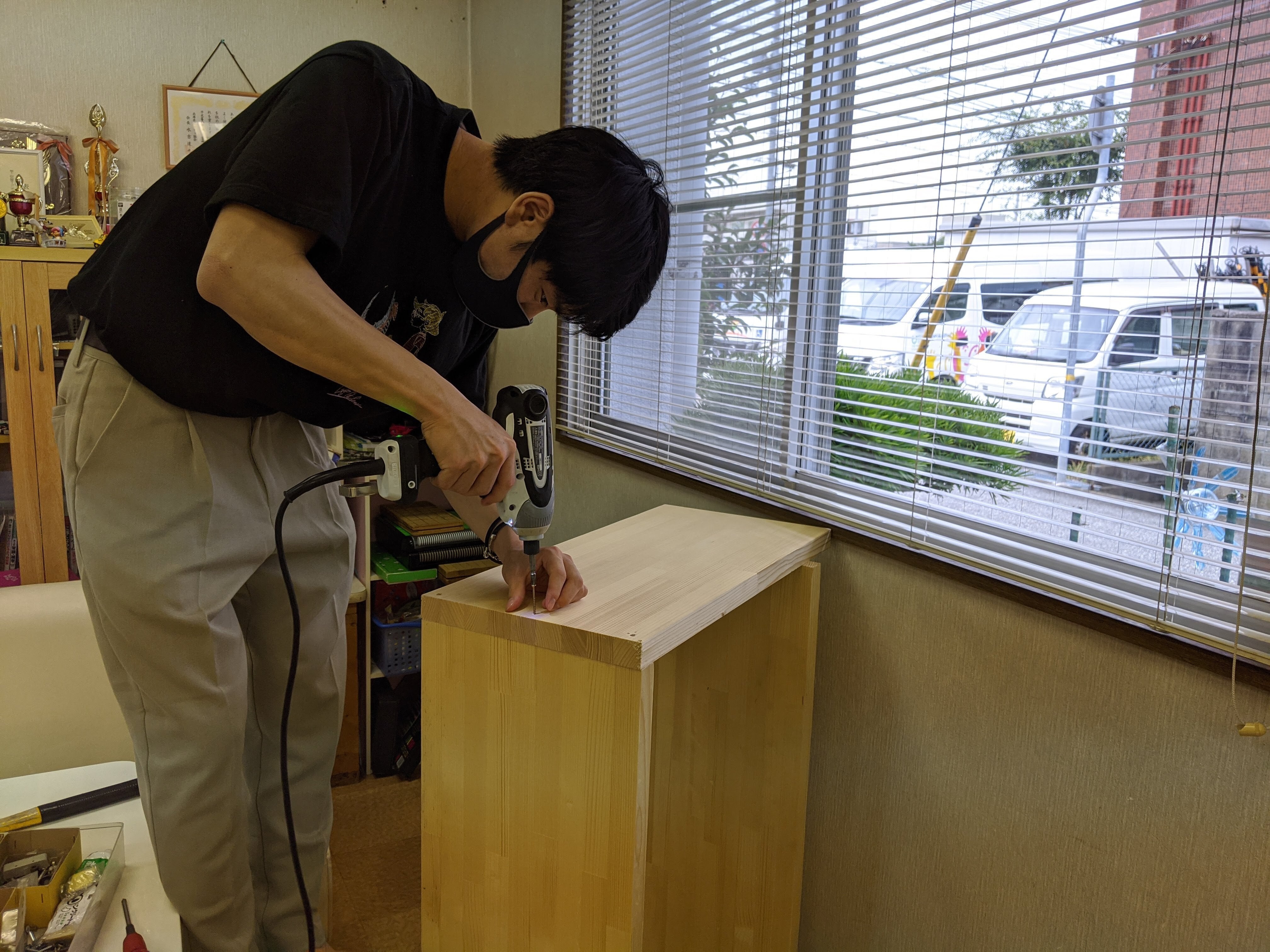 ▲設計・開発は、国立明石工業高等専門学校の石井君をはじめ、大塚研究室所属の学生さんにご協力いただいています。2020年12月現在、ひとまず試作の本棚を設置中。