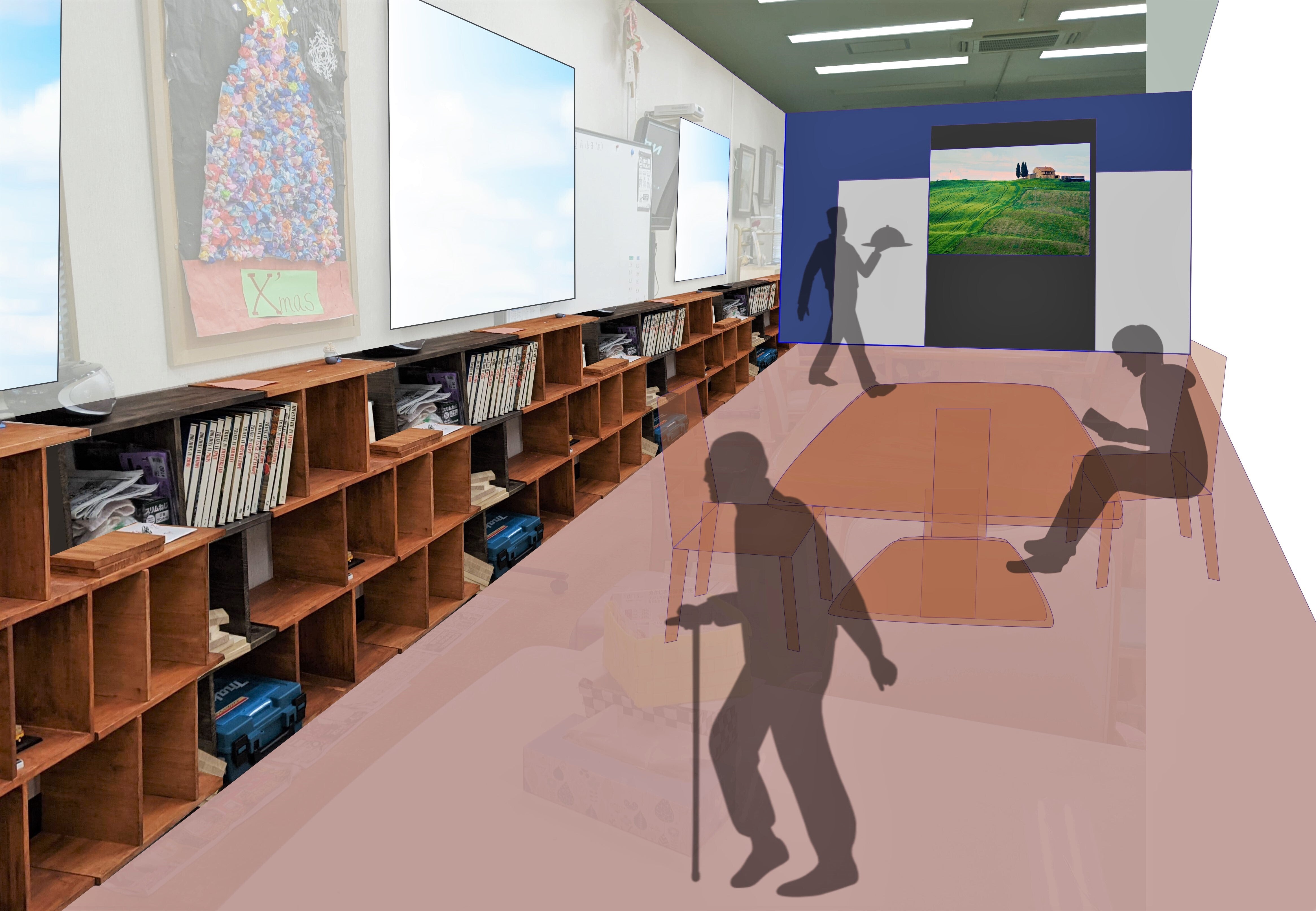 ※本ページに使用している図書館カフェの完成図は、あくまで現時点でのイメージです。壁紙の色や本棚の形状など、変更になる可能性がありますこと、ご了承ください。