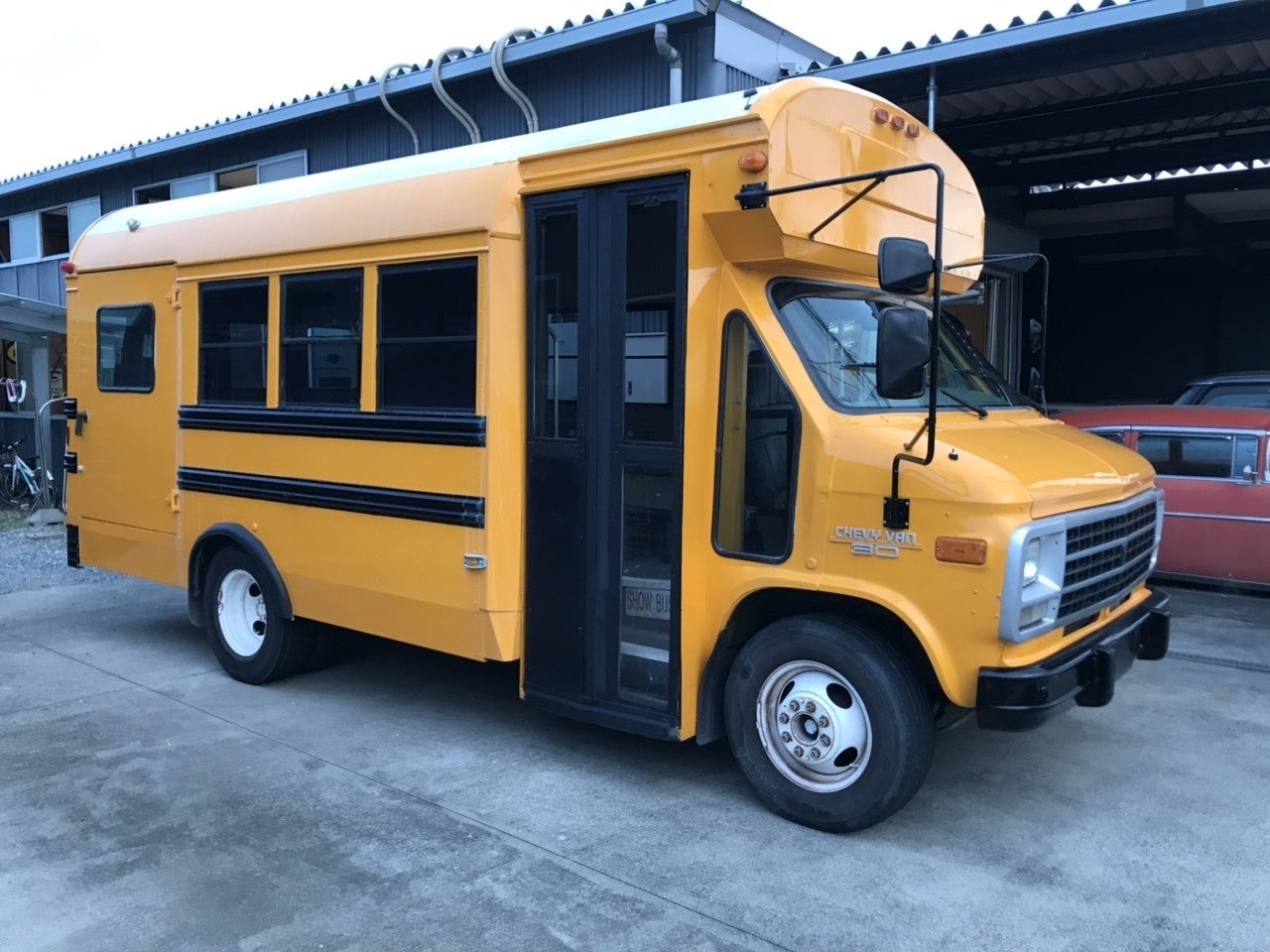 スクールバスはカリフォルニアより輸入した通称イエローバスと呼ばれる1995年型のシボレー シェビーバンです。