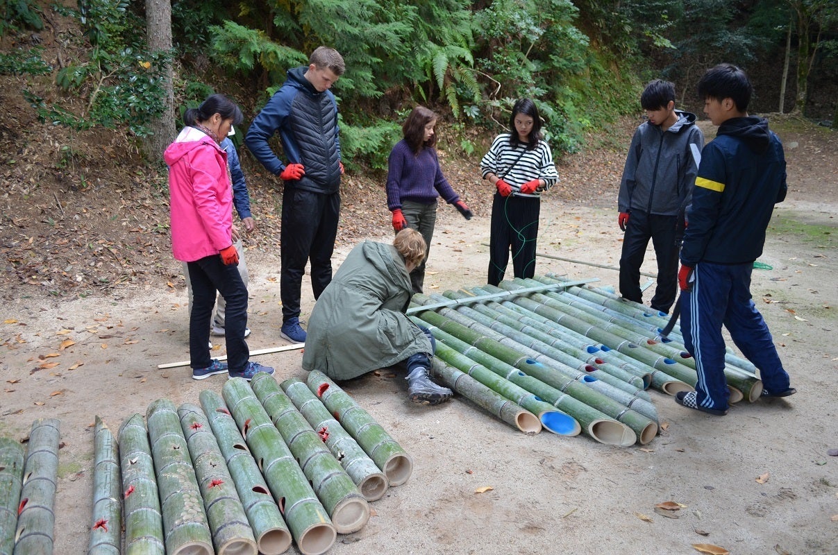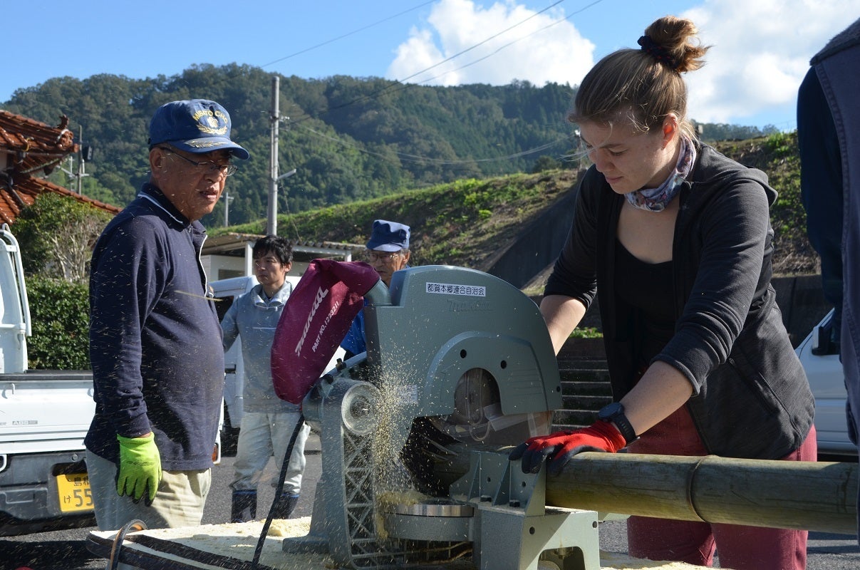 (👇の写真は、山から切ってきた竹を、デンマークから参加してくれた女性が、電動鋸を駆使して「竹灯籠」に加工しているところです)