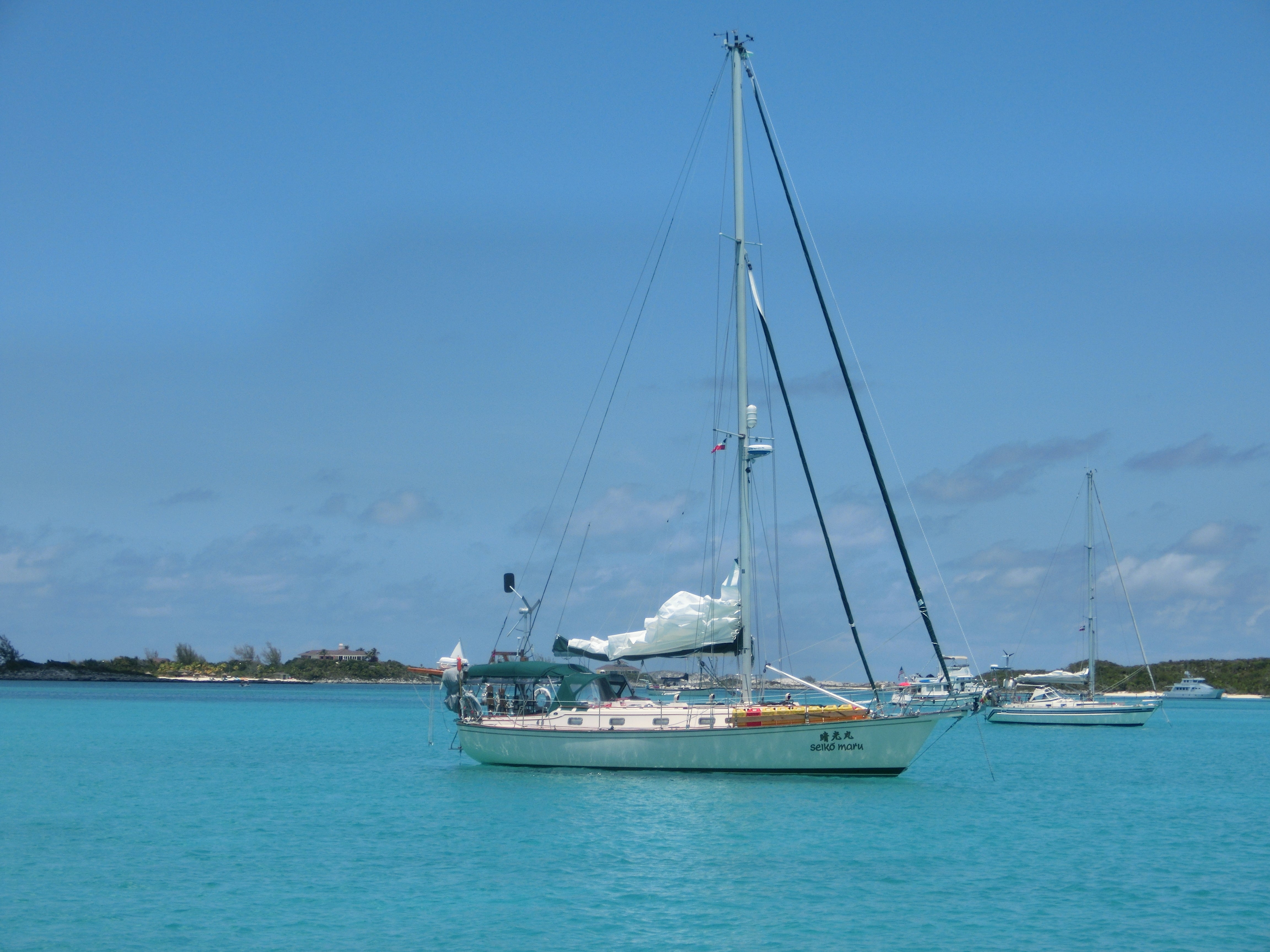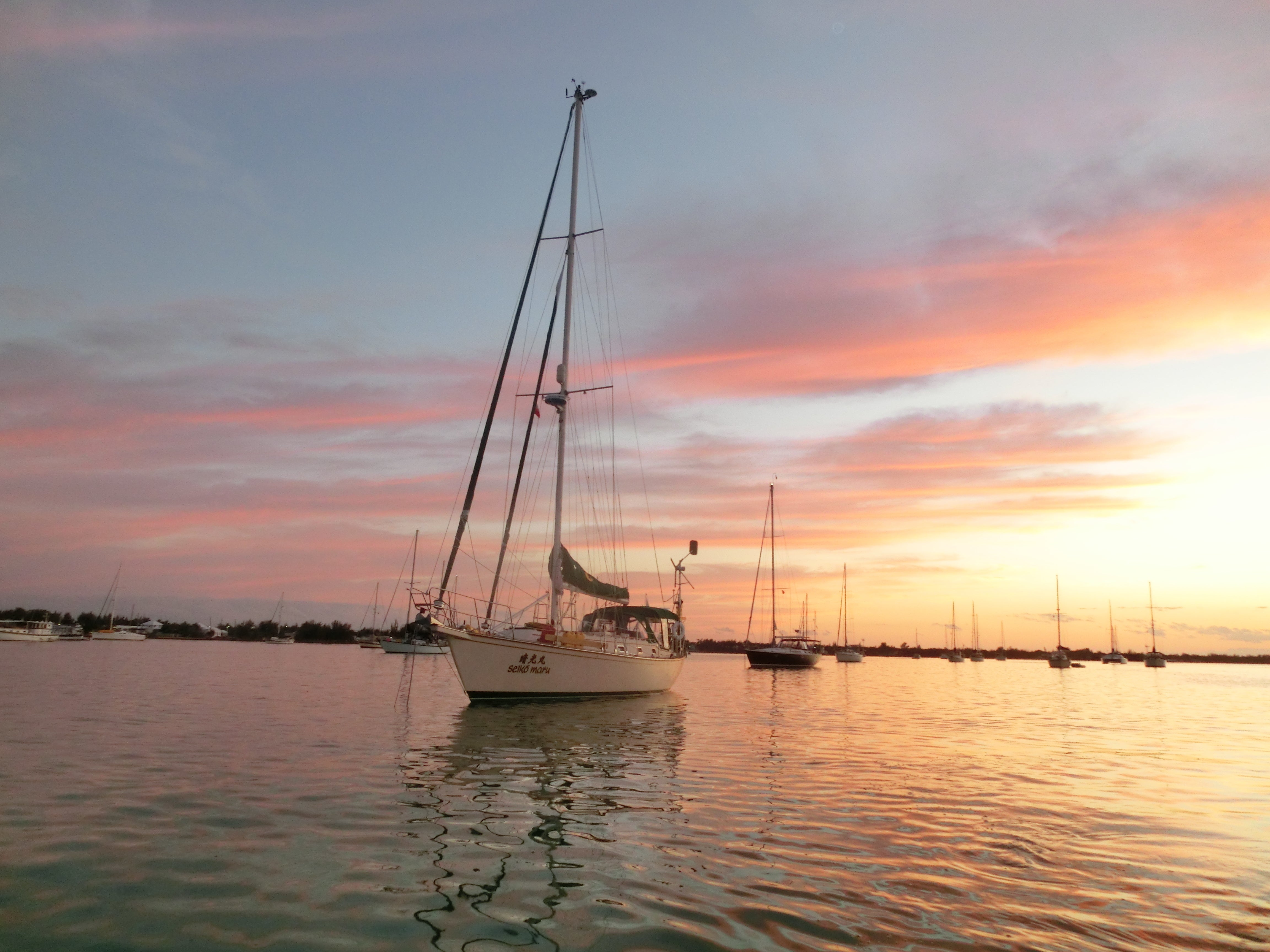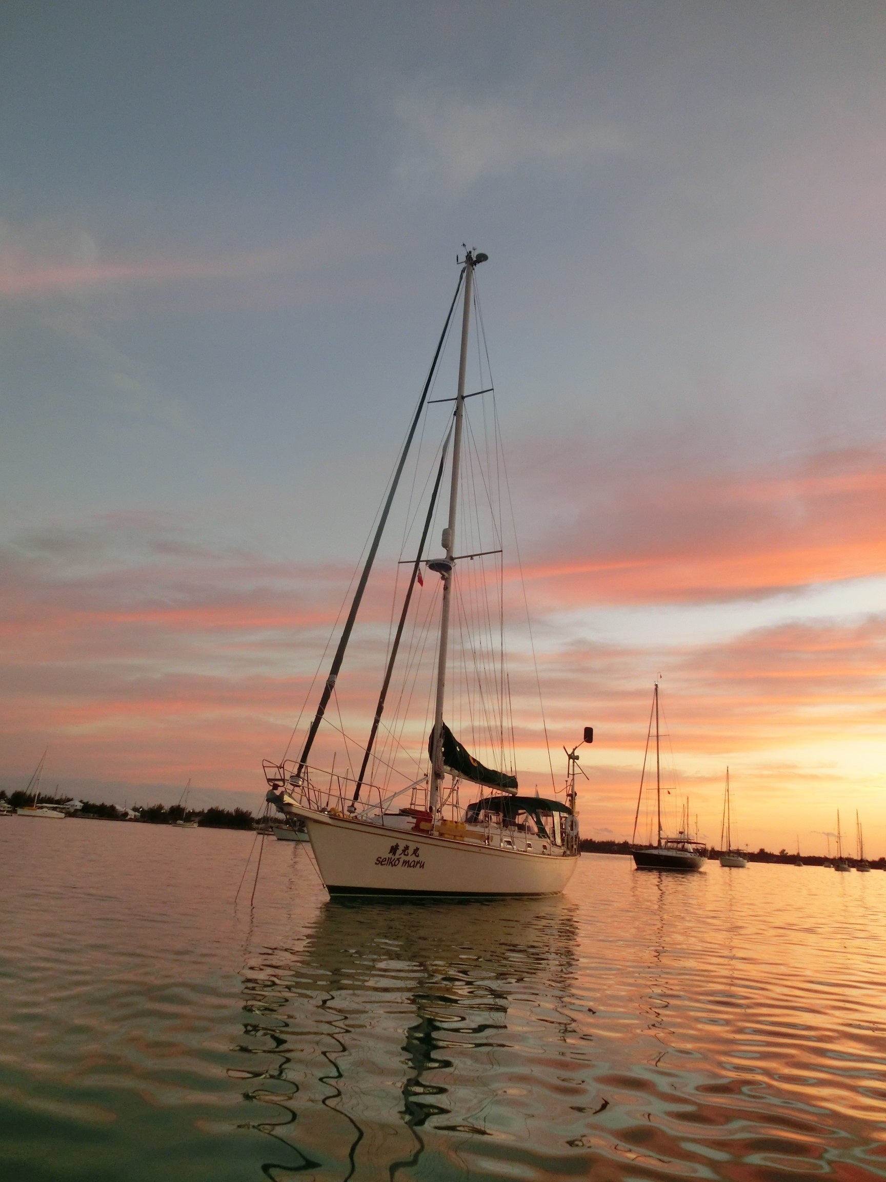 バハマ エクズマ に浮かぶ ‟晴光丸” 平和で美しいアンカレッジの夕景