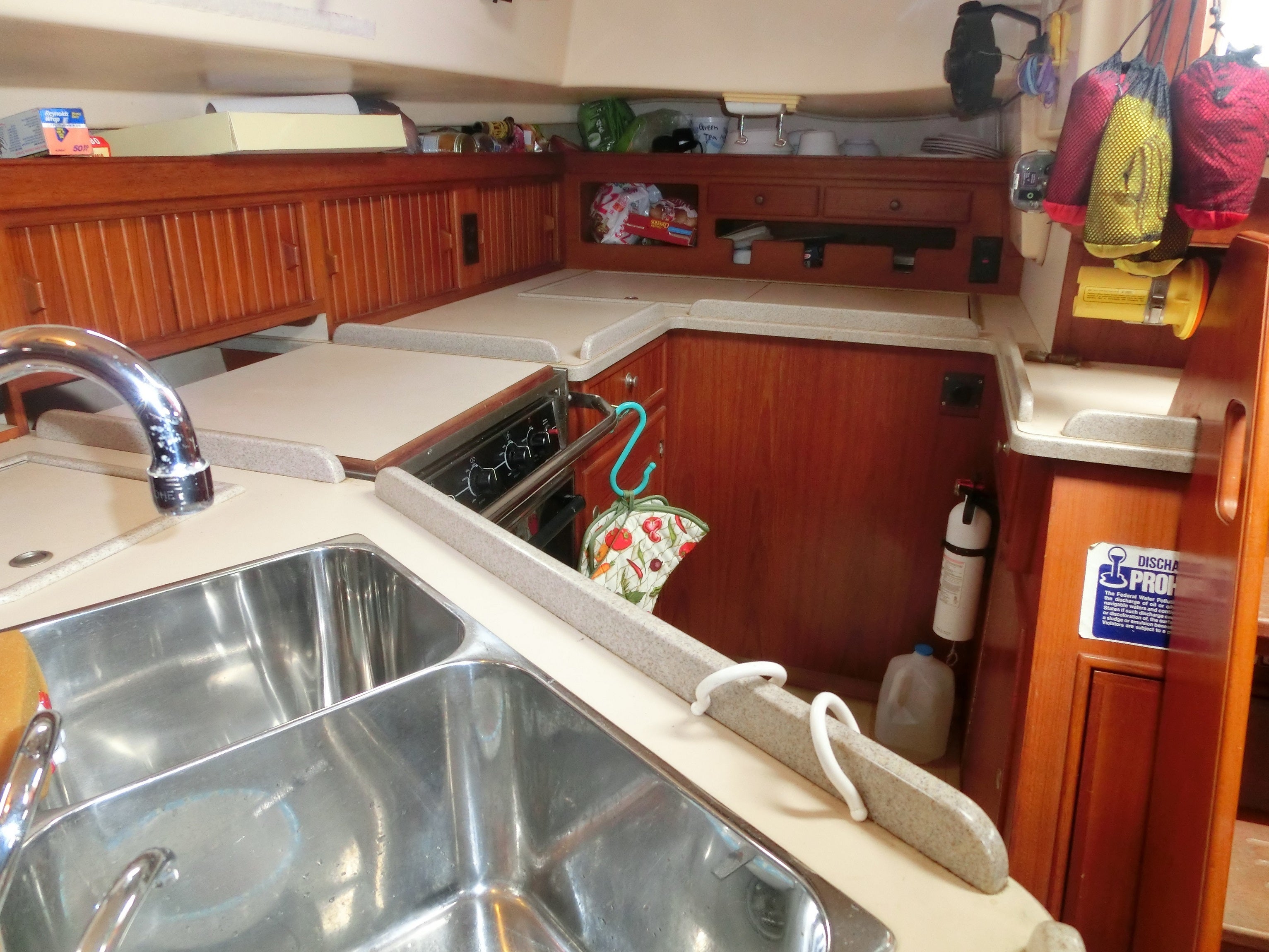 大きなキッチンにはステンレスのダブルシンク、お湯もお水も海水も出ます。大型の冷蔵庫、冷凍庫、三口ガスコンロ、大型ガスオーブン、電子レンジ、完璧なキッチンです。
