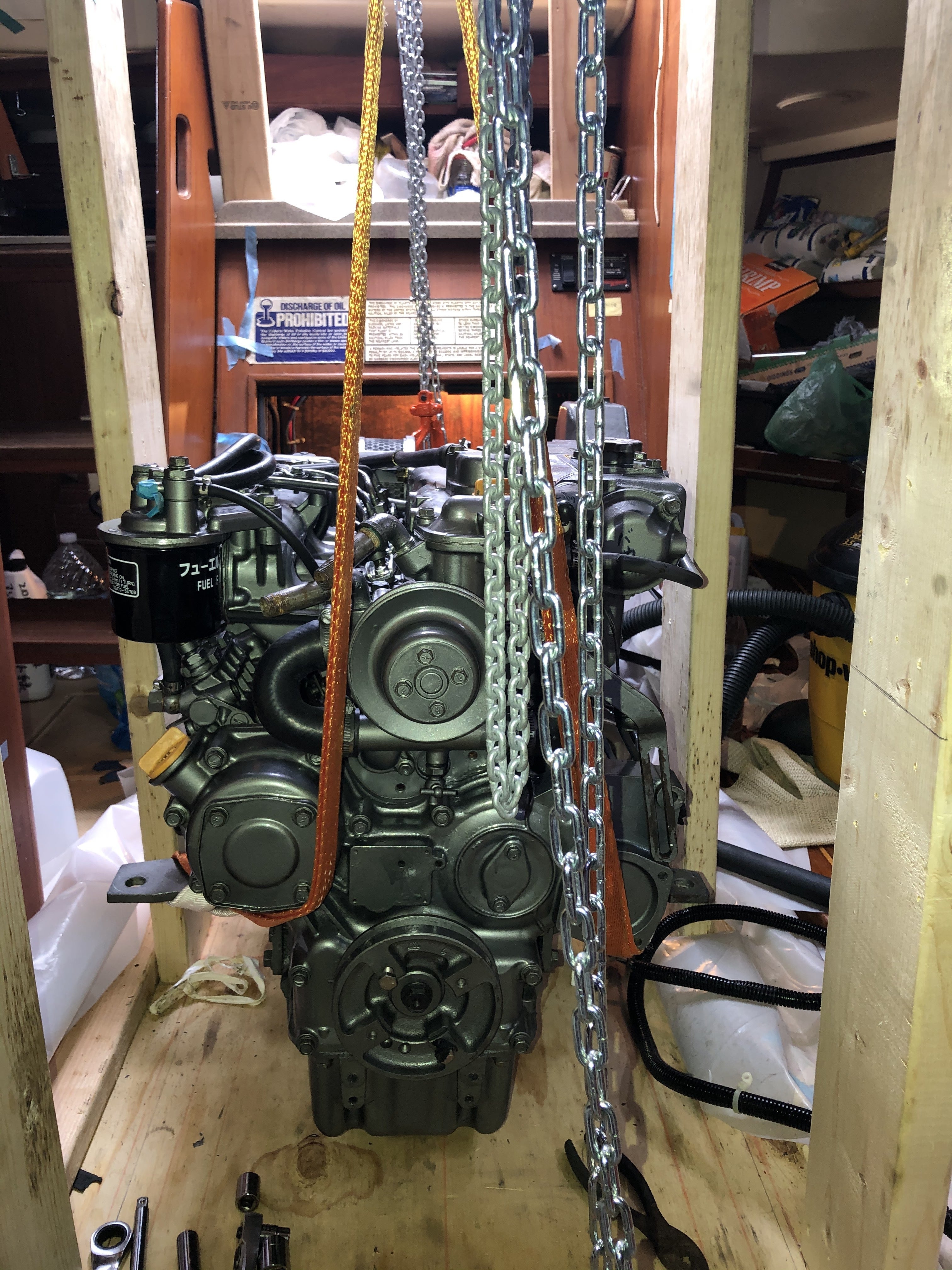 250㎏のディーゼルエンジンを木製フレームを自作。それに3つのチェーンブロックで釣ってエンジンルームから出しました。オーバーホール修理を全て一人で遣り切りました。