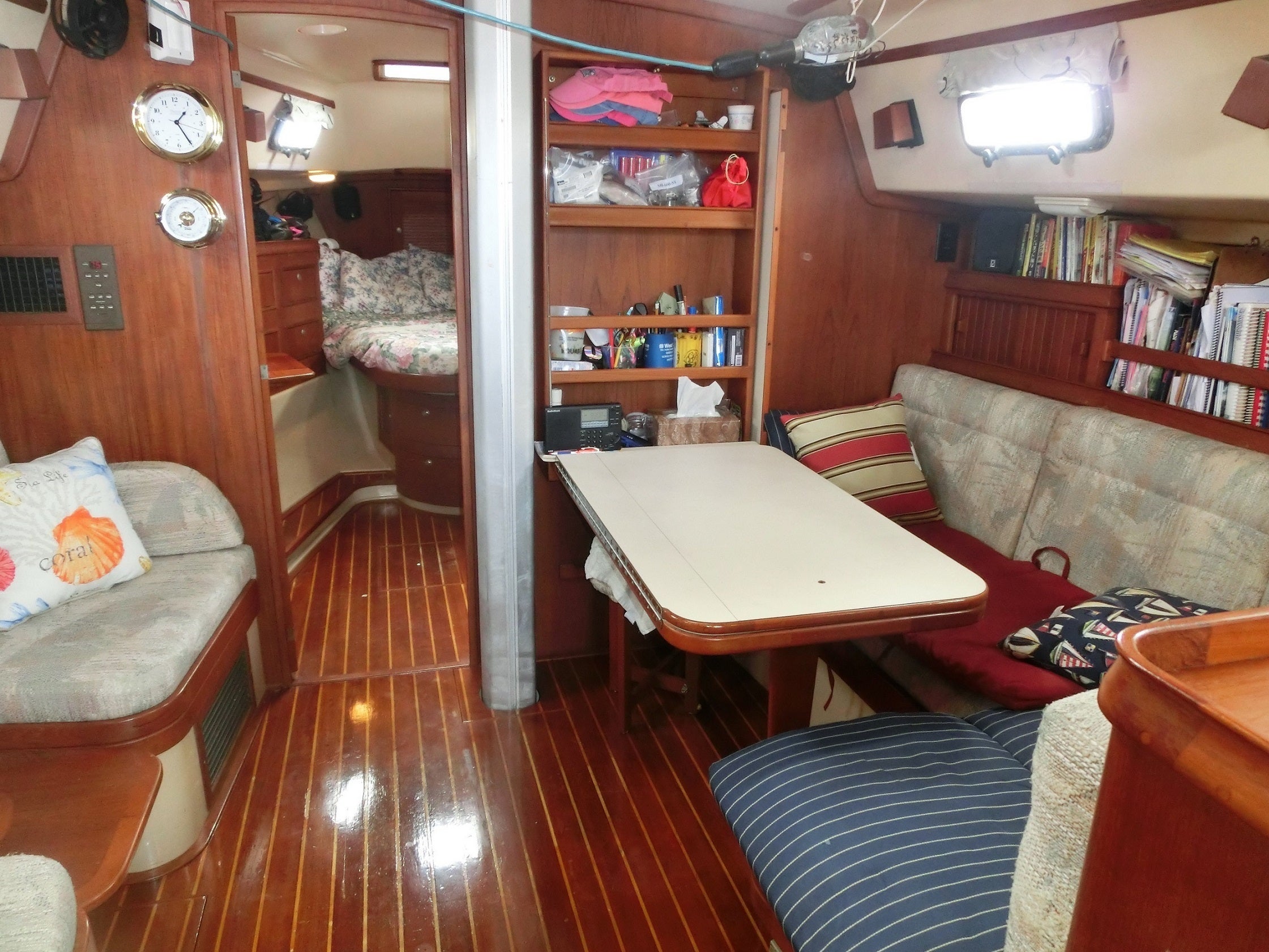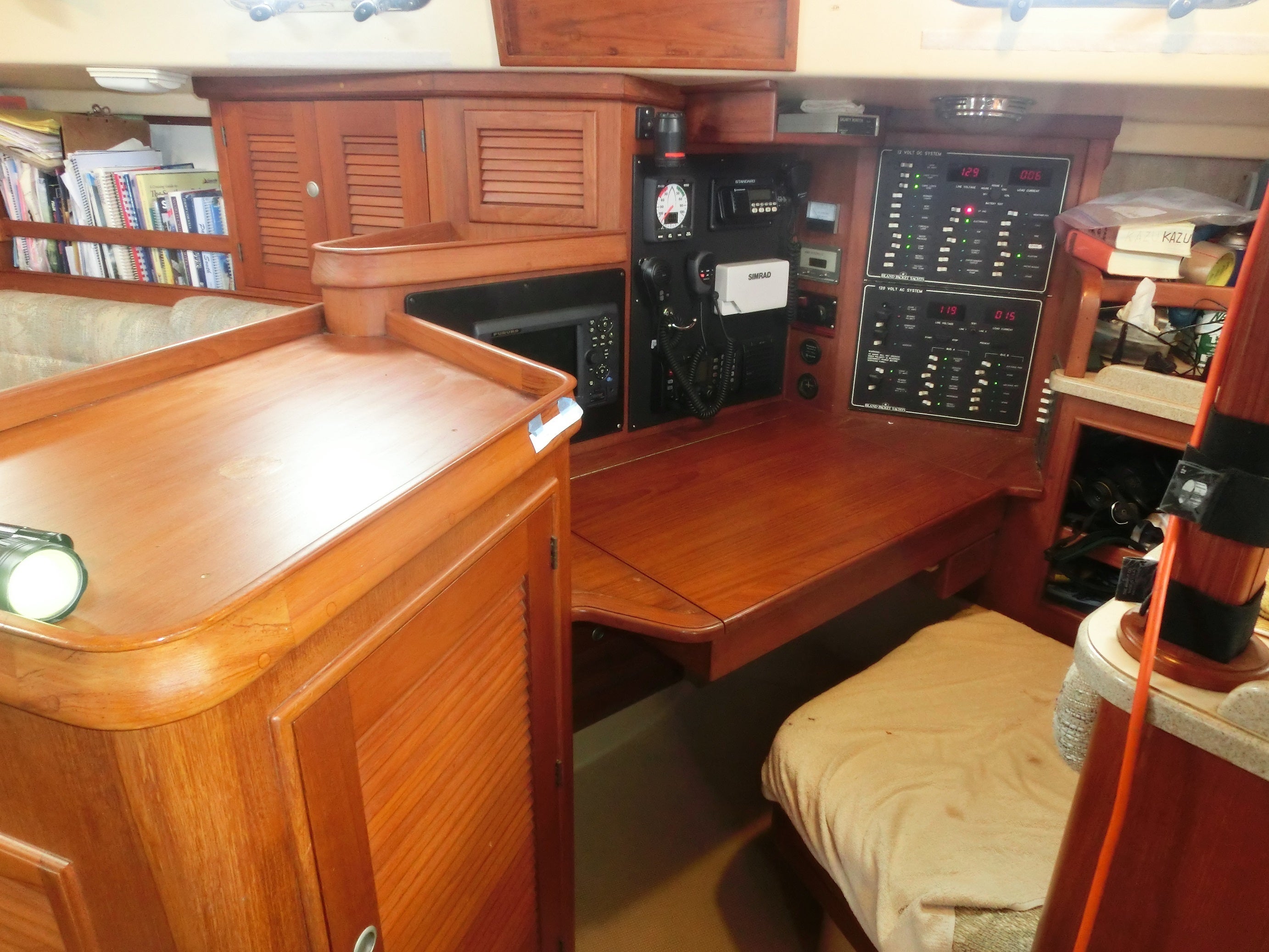 キャビンのナビゲーションルーム (フルノのナビ、VHF無線2機、SSB無線機、風速計、他)