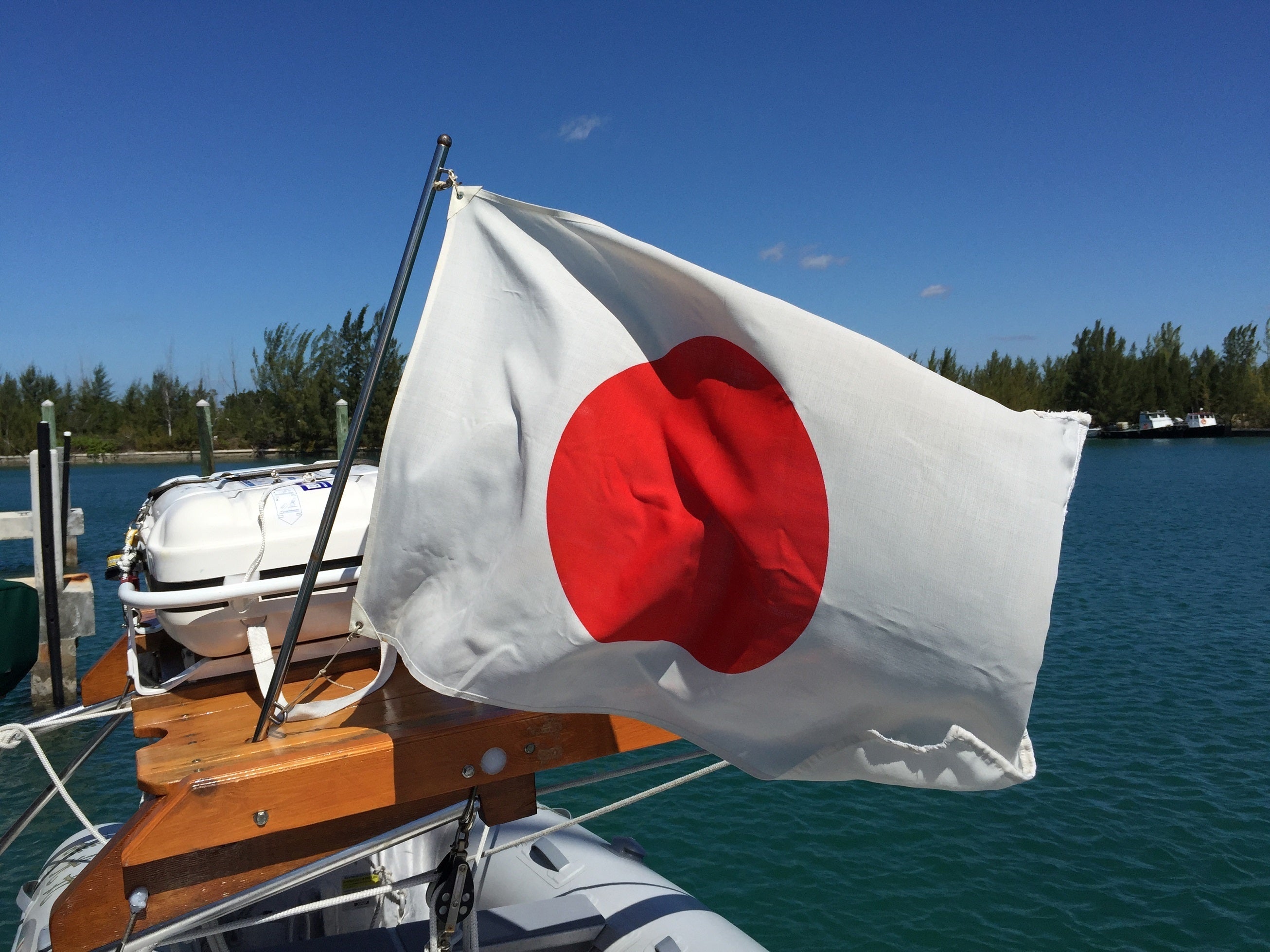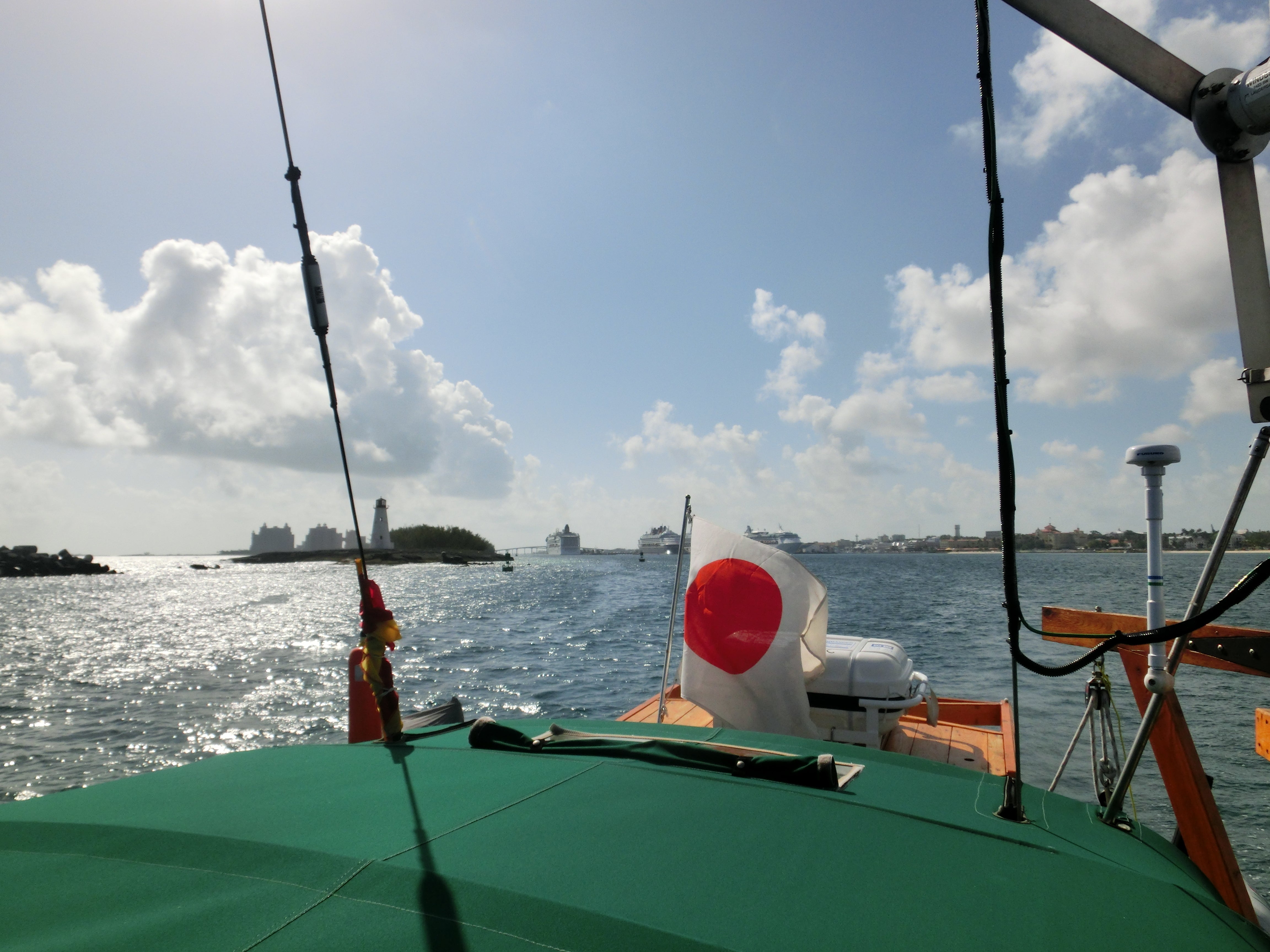 ナッソー港から出港 国旗/日の丸を掲げるのは国際ルールです。