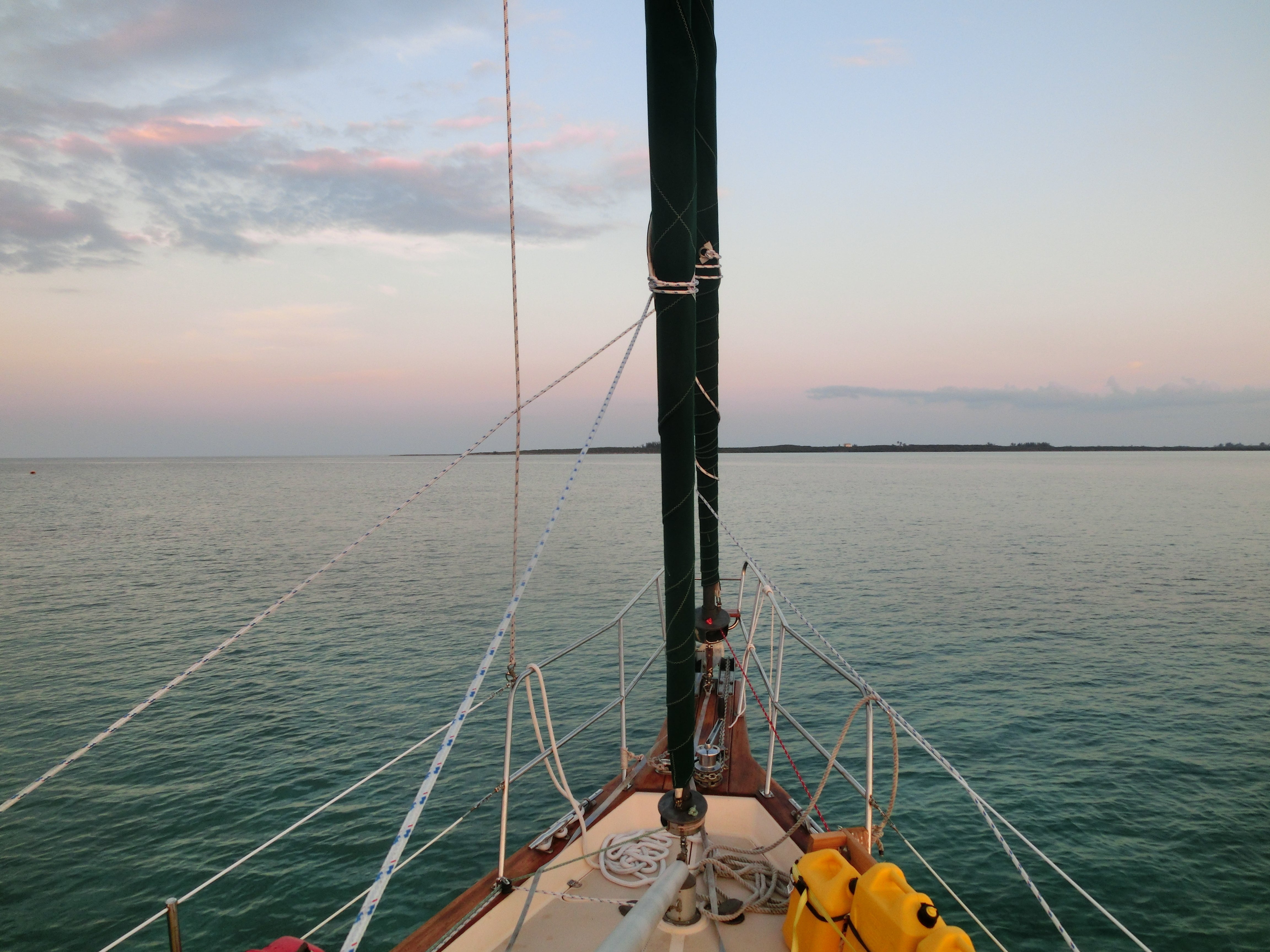 リエ バハマ錨地の夕景(ディンギー/ゴムボートで食事に行きます。)