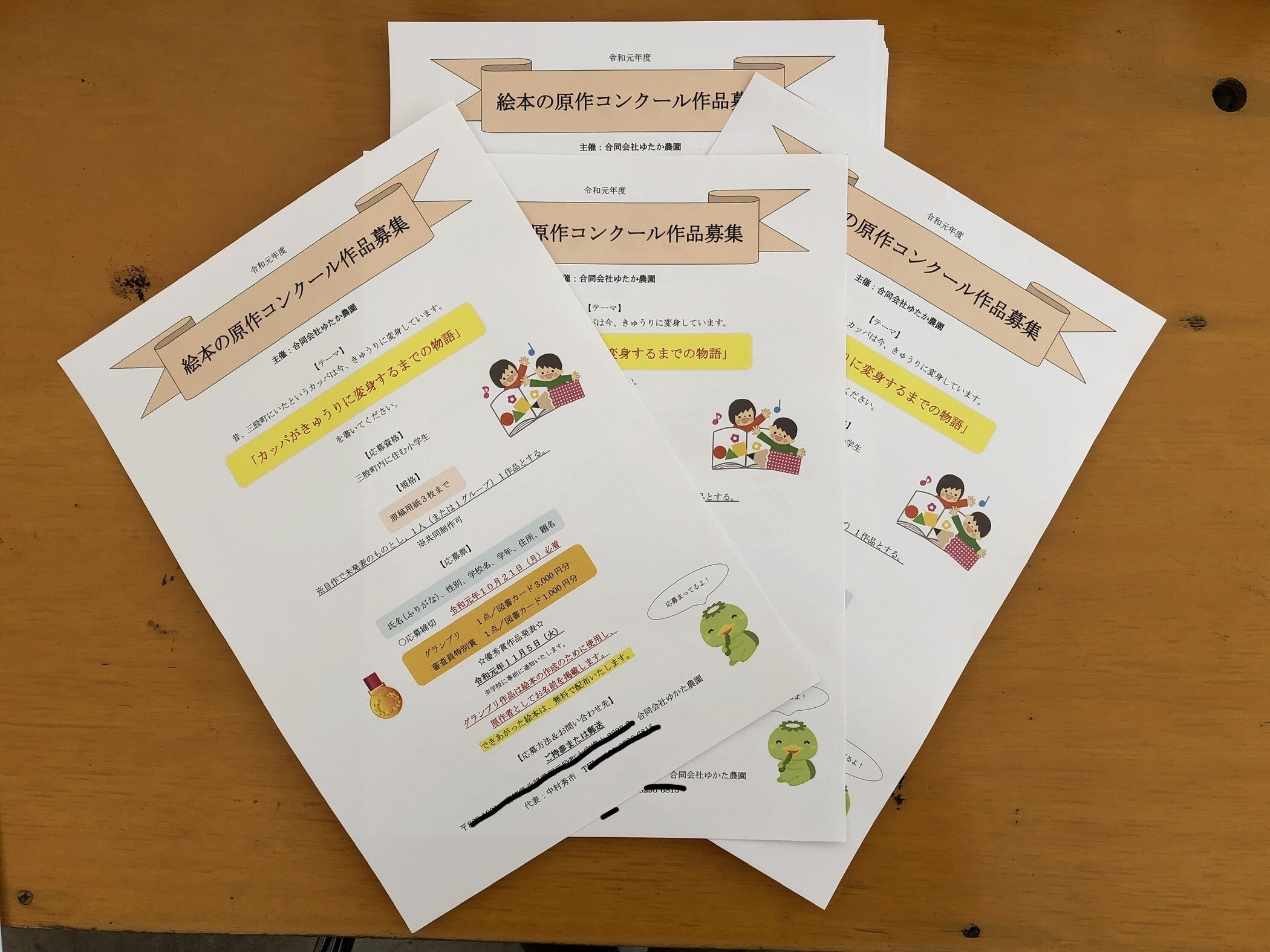 こんにちは!ゆたか農園の中村です。ページを見ていただき、ありがとうございます。本企画の目玉!小学生から絵本の題材となる物語を募集するチラシが完成。どんな物語が届くのか楽しみです^^パトロンの皆様、ご支援ありがとうございます!随時ご報告しますので、こちらもお楽しみください。