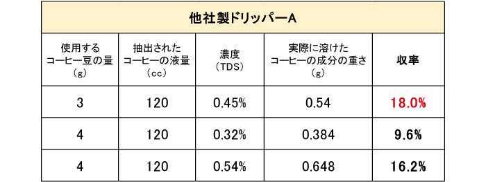 通常、10g前後のコーヒー粉量で1杯分ですが、実験はあえて少ないコーヒー粉量で行い、比較用に同条件で他社製のドリッパーも実験してみました。この実験結果では、バートドリッパーは少ないコーヒー粉量でも良いとされる範囲の値が出ました!