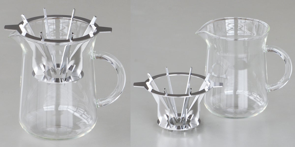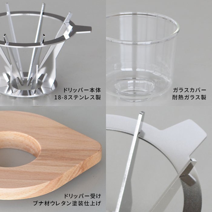 18-8ステンレス製のドリッパーは、バートドリッパーSと共通です。より気軽に使えるように耐熱ガラス製のカラフェとセットにしました。洗い物も少なくなり日常使いにおすすめです。夏は氷を入れて濃いめにドリップすればアイスコーヒーも作れます!カラフェは広口で洗いやすく、製品もコンパクトな設計(高さ約147mm)ですので食器棚にも収まります。匂い移りも気にならないステンレス&ガラス製ですから、コーヒー以外にも、ハーブティーを淹れたり、出汁をとったりしてもOKです。