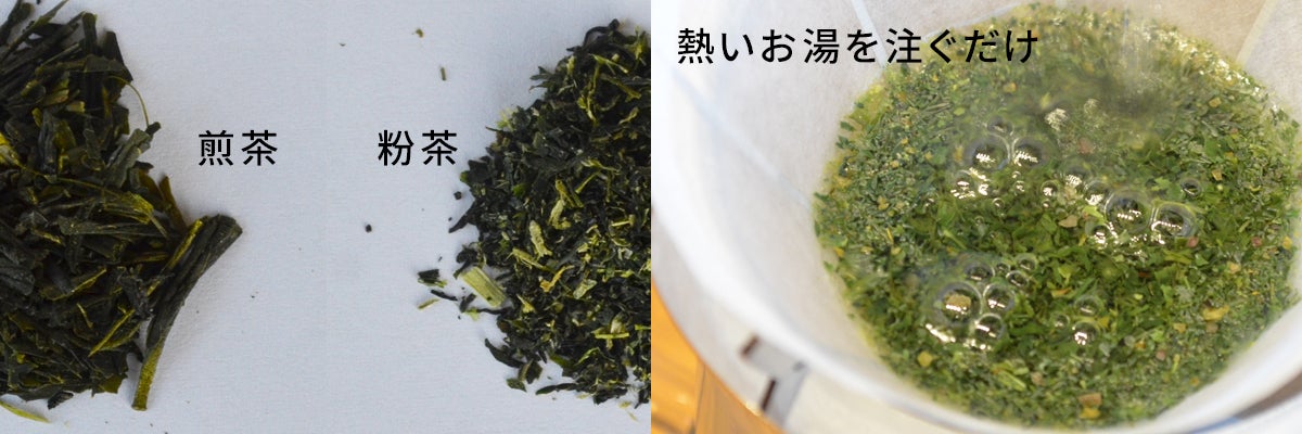 茶漉しや急須で淹れる方法と違う点は、ペーパーフィルターを使用しますので細かい茶葉がお茶に入りません。水筒などにお茶を淹れたい時などは便利ですね。また茶殻はペーパーフィルターを捨てるだけ。後始末も簡単です。※粉茶は、粉末茶(パウダー茶)ではありません。粉末茶はお湯で溶かして飲むお茶です。