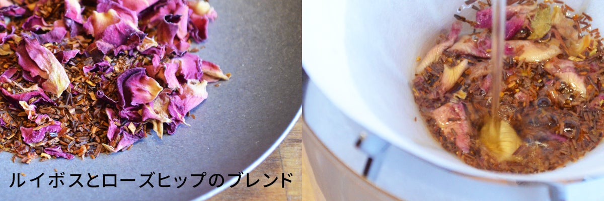 バートドリッパーでハーブティーを淹れることができます。特にルイボスティーはおすすめです。画像は、ローズヒップをブレンドした「ルイボスローズ」。ノンカフェインで美容やリラックス効果が期待できます。1杯(120cc程度)に、2~3gの茶葉です。