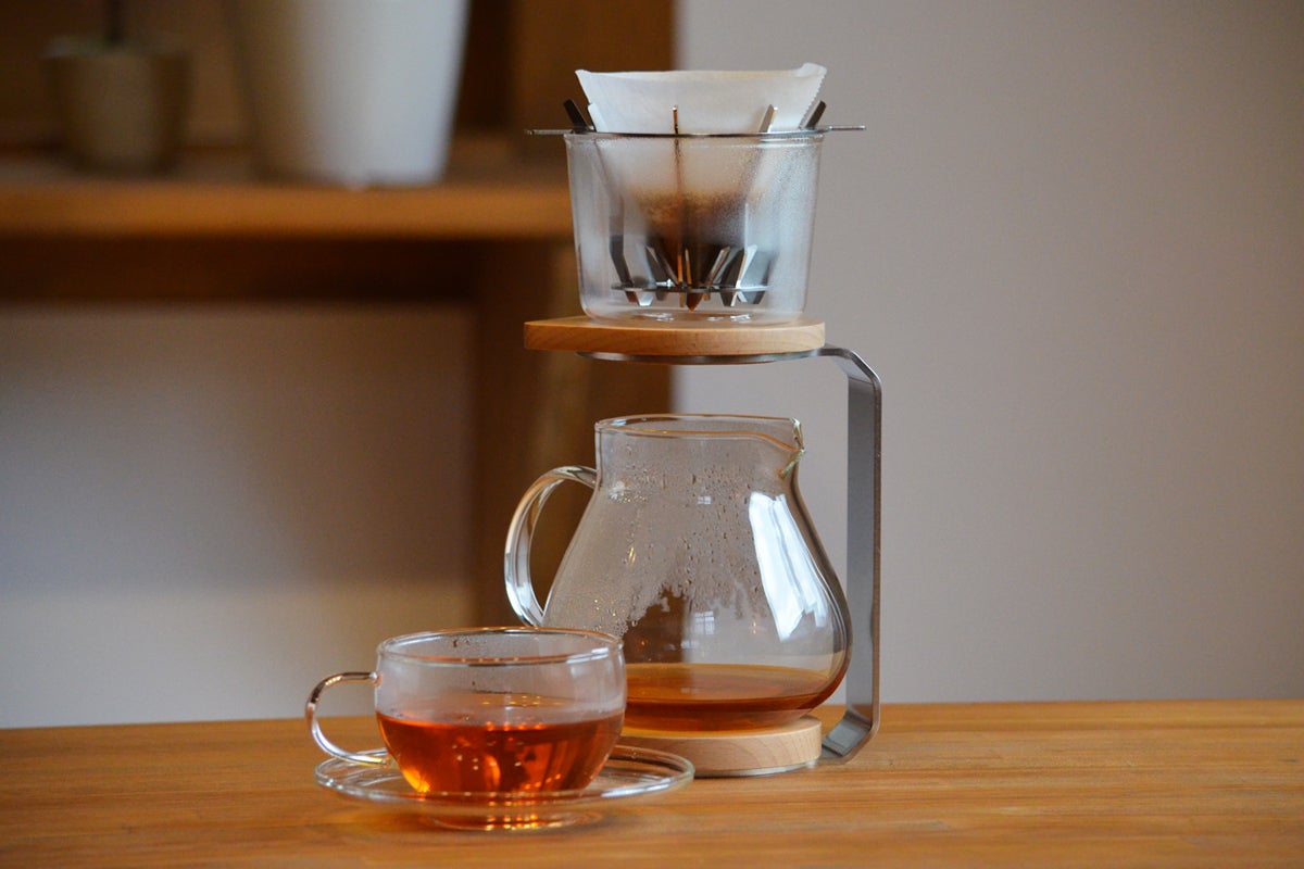 バートドリッパーで緑茶も淹れることができます。(※画像はコーヒーカラフェセットを使用)茶葉は、煎茶を作る製造工程で出た粉状の切れ端を集めた「粉茶」を使用します。お寿司屋さんでアガリとして出てくるお茶です。なぜ、「粉茶」かというと、熱いお湯で茶漉しを使って湯呑みに直接淹れるからです。蒸らさずに淹れるので、バートドリッパーのレシピと全く同じ。1杯(120cc程度)に、2~3gの粉茶をバートドリッパーに入れて熱いお湯を注げばすぐに香り豊かな緑茶をいただけます。