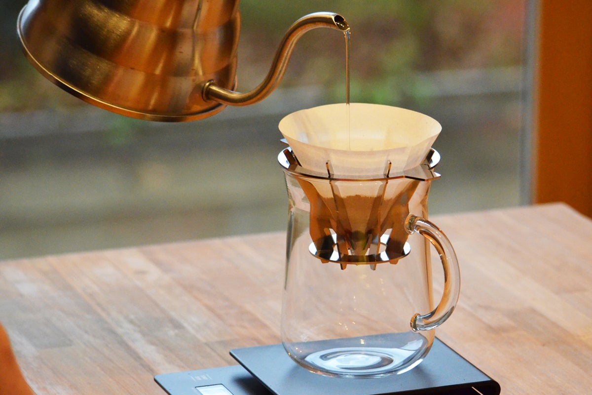 さらに垂直方向だけでペーパーフィルターを支えるため、抽出されたコーヒーはどこにも留まることなく円錐の頂点から落ちていきます。お湯が素直にペーパーフィルターを通過するので、どんなふうに淹れたかがそのままコーヒーに現れます。つまり淹れ手は自由に抽出を愉しめるということです。