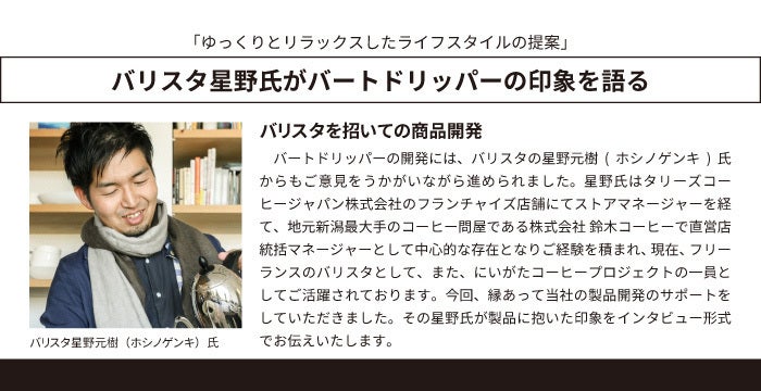 休日や、一日の特別な時間に、ちょっと良い豆でコーヒーを淹れる。コーヒーのいい香りがたちはじめ、家の中がやさしさにつつまれる。「これ美味しいね。」と言われたから、もうちょっとだけ凝ってみようかなと思う。パートナーとゆっくり過ごすため、あるいは自分と向き合うために・・・。こんな情景を思い描きながらバートドリッパーは生まれました。