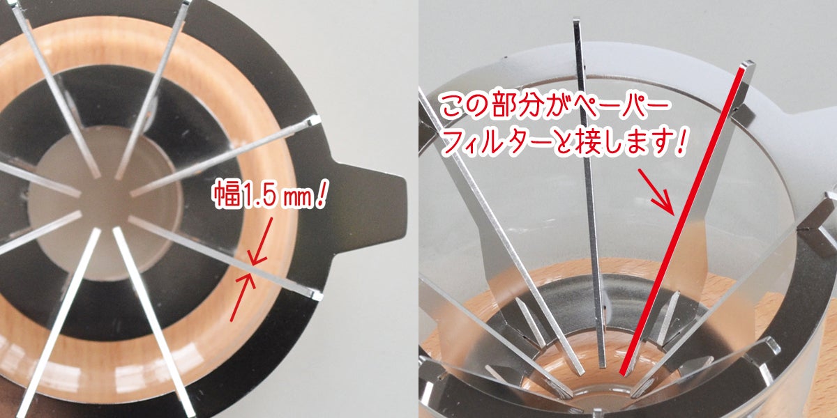 抽出時にペーパーフィルターがわずかに横方向に伸びることを想定し、ペーパーフィルターにシワやたるみができにくい設計としました。これは、お湯を投入した際にペーパーフィルターにできるシワやたるみにコーヒー粉が留まることを軽減しますので、コーヒー粉全体にお湯が均等にゆき渡りやすくなり抽出効率アップが期待できます。抽出後半までペーパーフィルターのフチはきれいな円を保つので視覚的にも淹れ手はお湯の投入に集中しやすいでしょう。