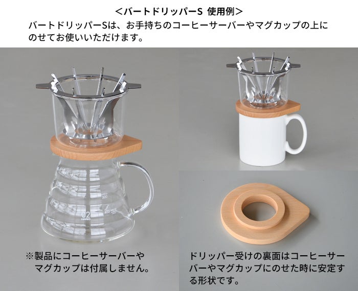 バートドリッパーSのドリッパー本体と、そのサイズに合わせたカラフェのセットです。 ※実使用容量:300ml カラフェは1~2杯程度の量にちょうど良いサイズ。より気軽に、日常使いにおすすめです。