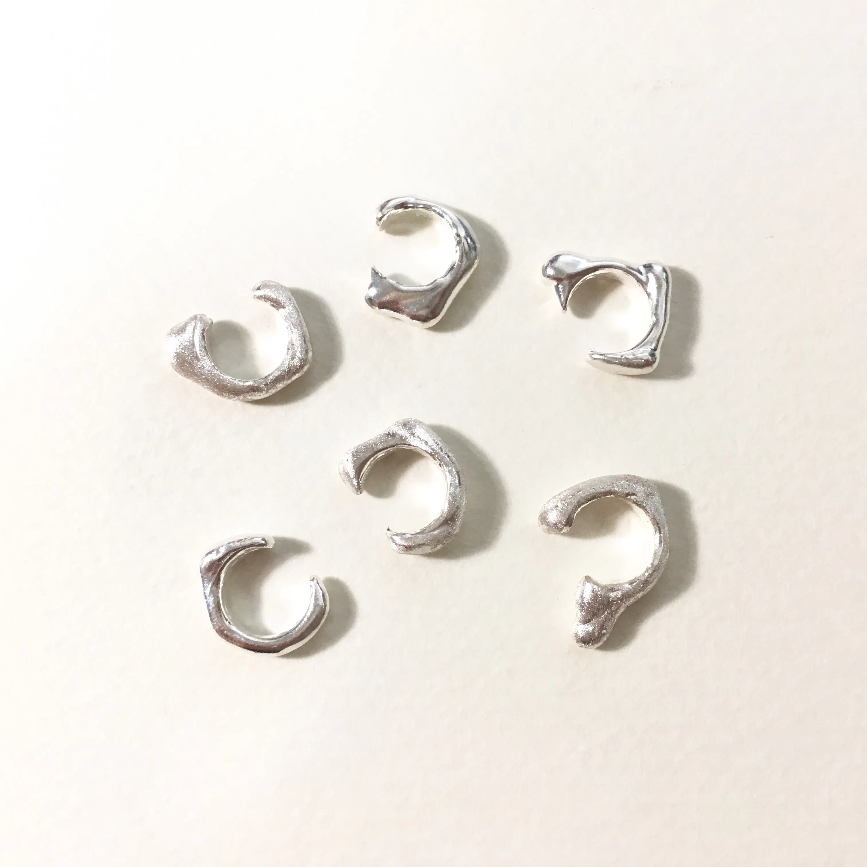 シルバーのジュエリーはひとつひとつ手で形を作っていて、主にはワックスという材料を使っています。それを溶かしてちびちび盛り付けたり、溶けたものをぐるっと輪にして形を作っています(写真のイヤーカフがそれです)。なので同じものは二度と作れません!