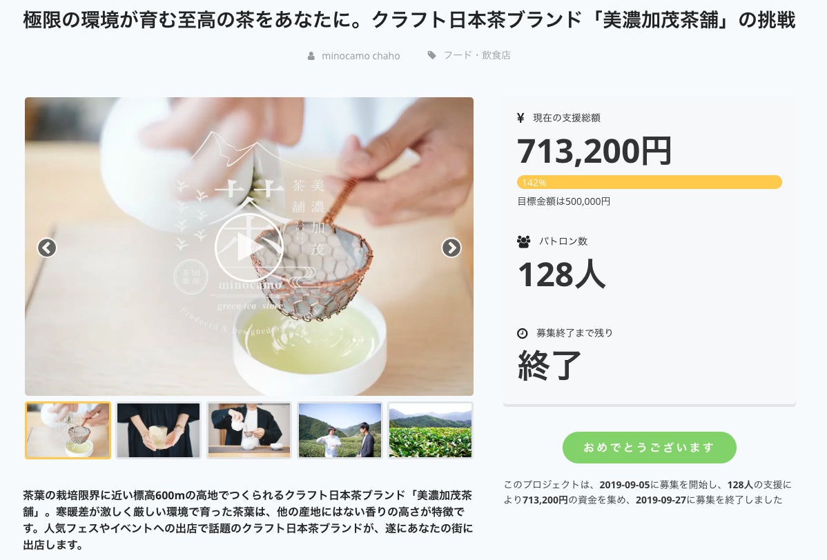 2019/09/28 17:39美濃加茂茶舗クラウドファンディング終了しました。美濃加茂の店舗だけでなく、各地で開催するポップアップストア出店やイベントで美濃加茂茶舗が提供する日本茶の魅力をお届けしたいという想いで、今回はじめてクラウドファンディングの企画を立ち上げました。皆様の応援のおかげで128人の方から713,200円のご支援をいただくことができ、目標金額を達成することがました。ご支援、SNS等で拡散いただいた皆様本当にありがとうございました。いただいたご支援をもとにたくさんの方に美濃加茂茶舗のお茶をお届けしていきたいと思いますので、今度とも引き続き美濃加茂茶舗をどうぞ宜しくお願い致します。 もっと見る
