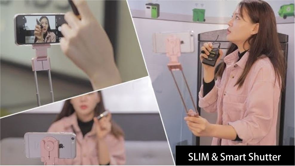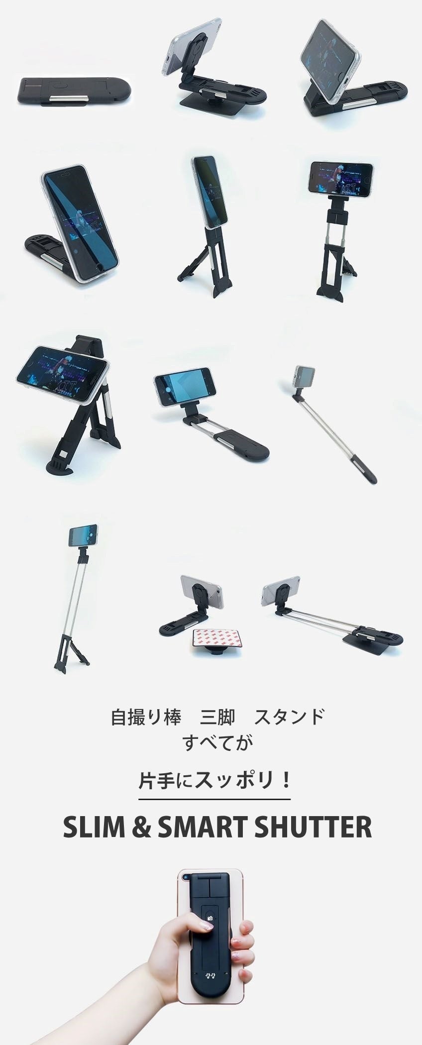 その軽さの中に、Bluetoothリモコンを内蔵し、自撮り棒・三脚・スタンド、様々な機能を完全に装備しました。