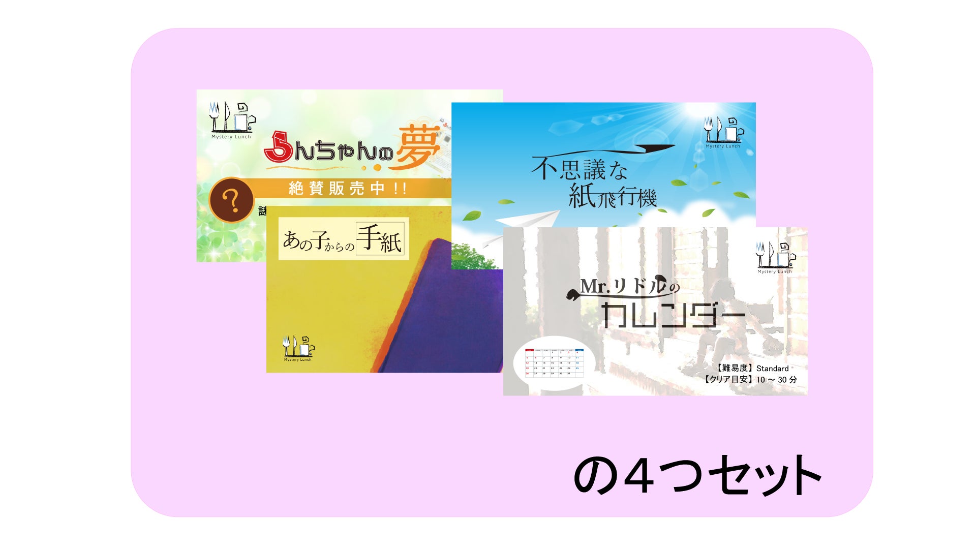 9、MysteryLunchセット(らんちゃんの夢、あの子からの手紙、不思議な紙飛行機、Mr.リドルのカレンダー計4種) 2100円