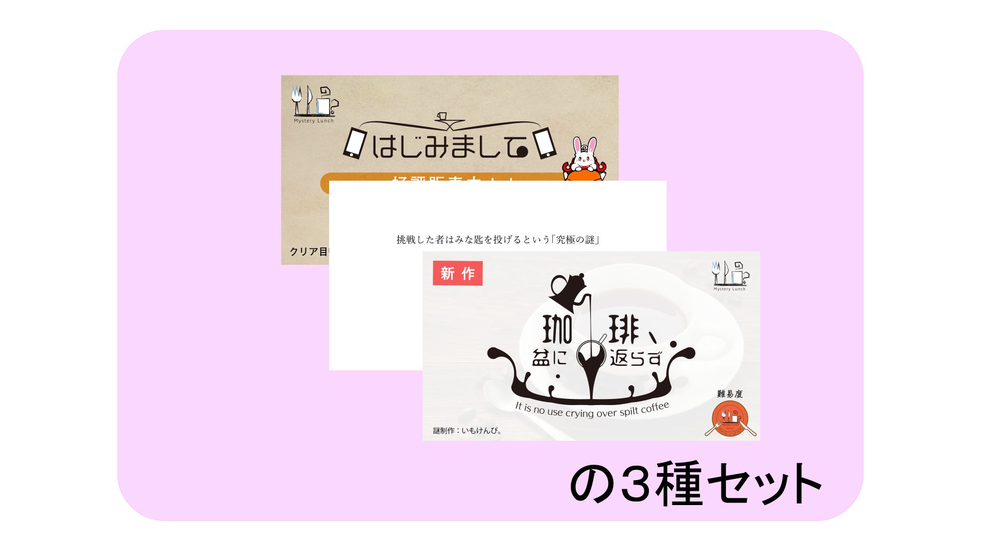 MysteryLunchの新作の3種を詰め合わせました。難易度がstandardとspicyとなっているので謎解きに自信がある方はご検討ください。自信作が詰め込まれています!