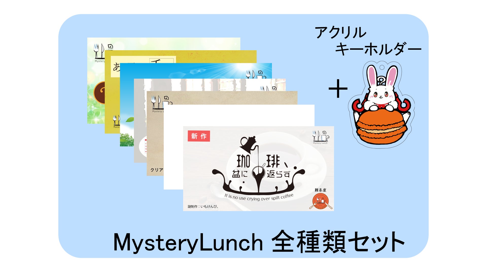 MysteryLunchが今までに製作した全7種類をセットにしました。またこのセットにはイメージキャラクターのらんちゃんのアクリルキーホルダーがおまけでつきます!