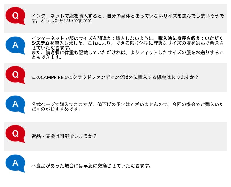 A:プロジェクト開始前まではページ上部の『フィードバックを送る』より、プロジェクト開始後は当プロジェクトページの上部に『メッセージで意見や質問を送る』欄からお問い合わせいただきますようお願いいたします。(CAMPFIREアカウントが必要です)