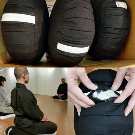 渋谷での「安楽坐禅法体験会」では、友人の僧侶に、お寺で坐禅の際使用している坐蒲(ざふ)を10個ほど、会場まで担いで持ってきていただきました。