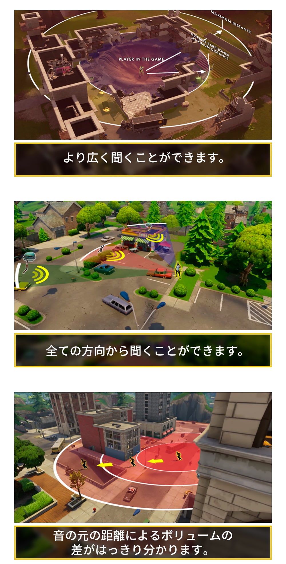 X, Y, Z軸から全ての方向で見えないところからのサウンドを聞くことができます。