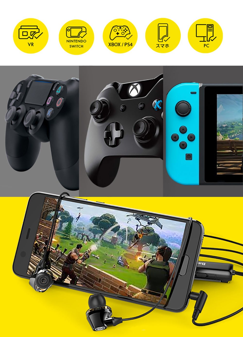 NINTENDO SWITCH、XBOX、PS4、VR及びモバイルデバイスを含め、3.5㎜出力のすべてのデバイスにお使いください。GAMOイヤホンとPC及びMACに使う場合、同梱された3.5㎜オーディオアダプターケーブルを使って連結してください。