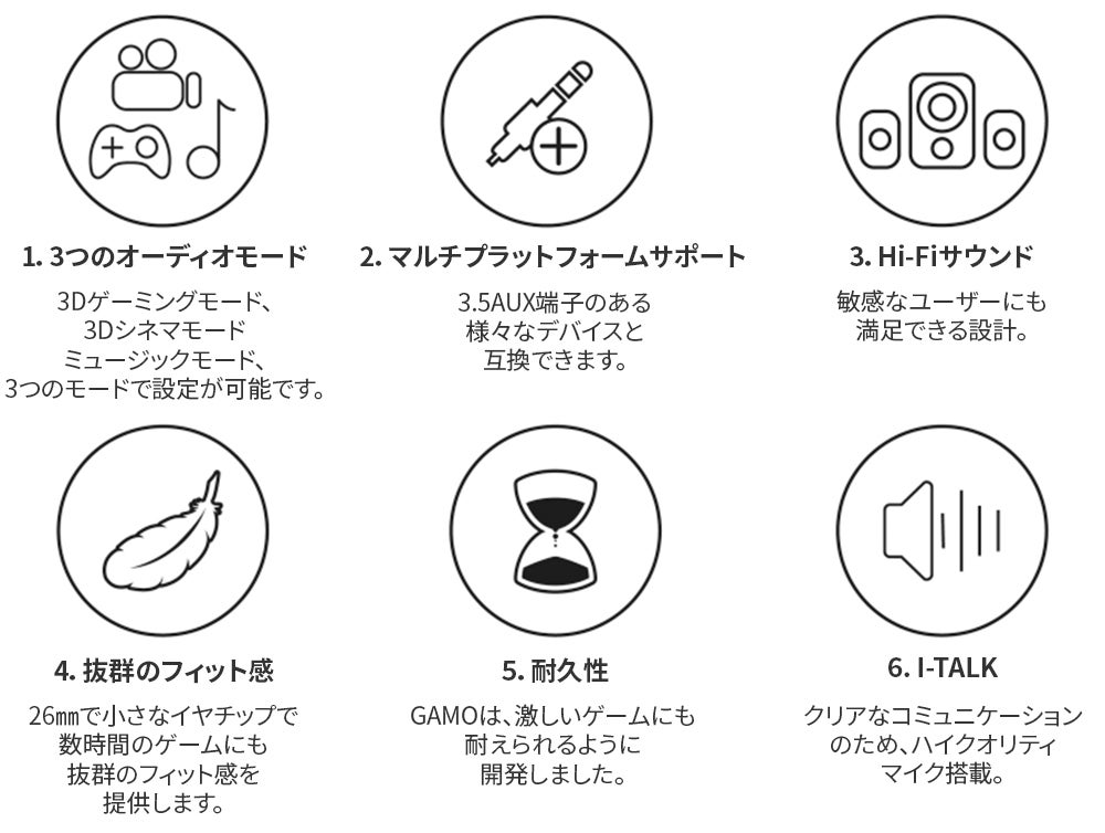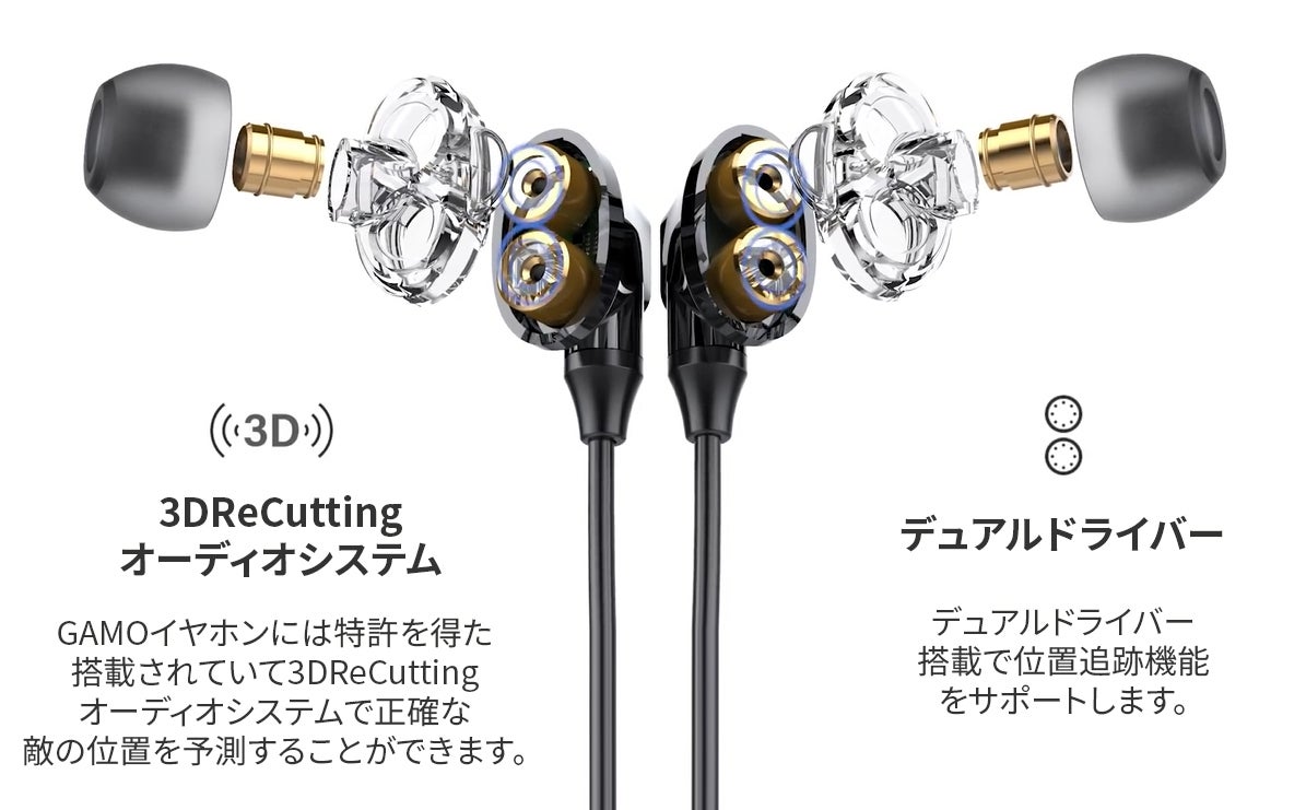 GAMOはきめ細かなサウンドさえ追跡し、強力なデュアルドライバーシステムを通じ耳に情報を伝える革新的なイヤホンです。こうしたディテールは敵を探し、意思決定を速めることができる上、勝利の可能性を高めます。