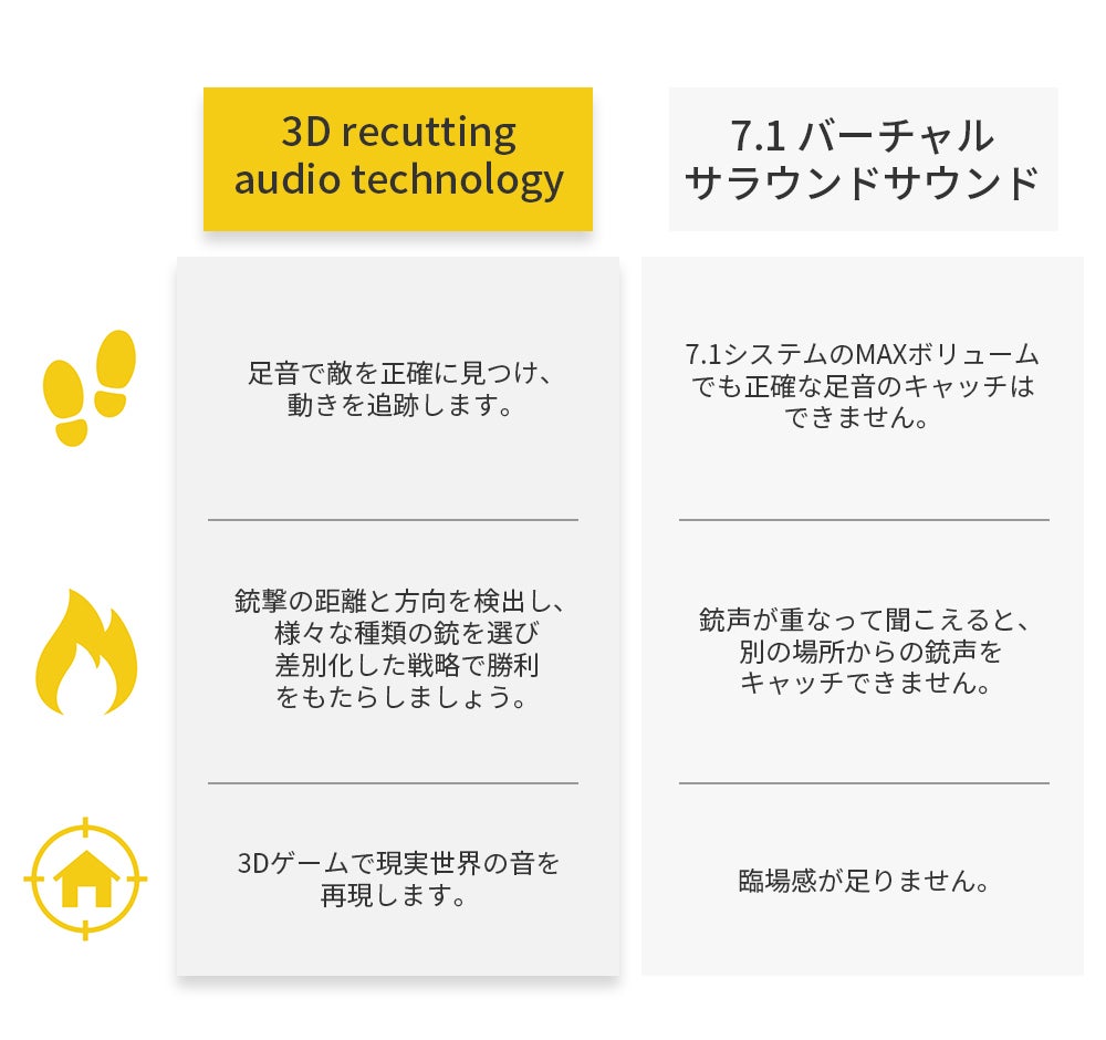 3Dバーチャルアルゴリズムはペア(右・左)のイヤホンの2つのサウンドに基づきます。既存のバーチャルアルゴリズムは7つ(または5つ)のソースに基づき制作されているため、2つのフィールドに基づいて制作されたイヤホンでは敵を正確に見つけることができません。