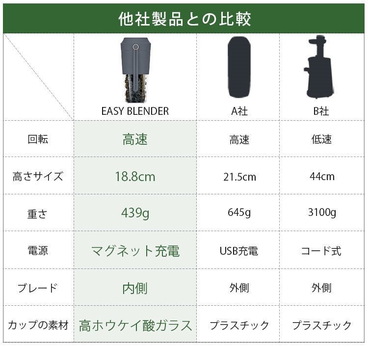 本製品「EASY BLENDER」はそれらを一挙解決。ほかの製品にはないさまざまな機能をコンパクトにまとめました。