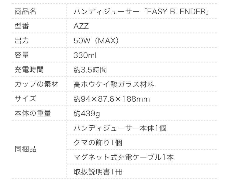 ハンディジューサー本体1個、クマの飾り1個、マグネット式充電ケーブル1本、取扱説明書1冊