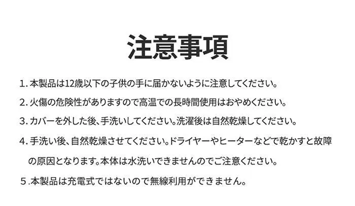 カバーのみ水洗い可能です。本体は絶対に洗濯しないでください。故障の原因となります。