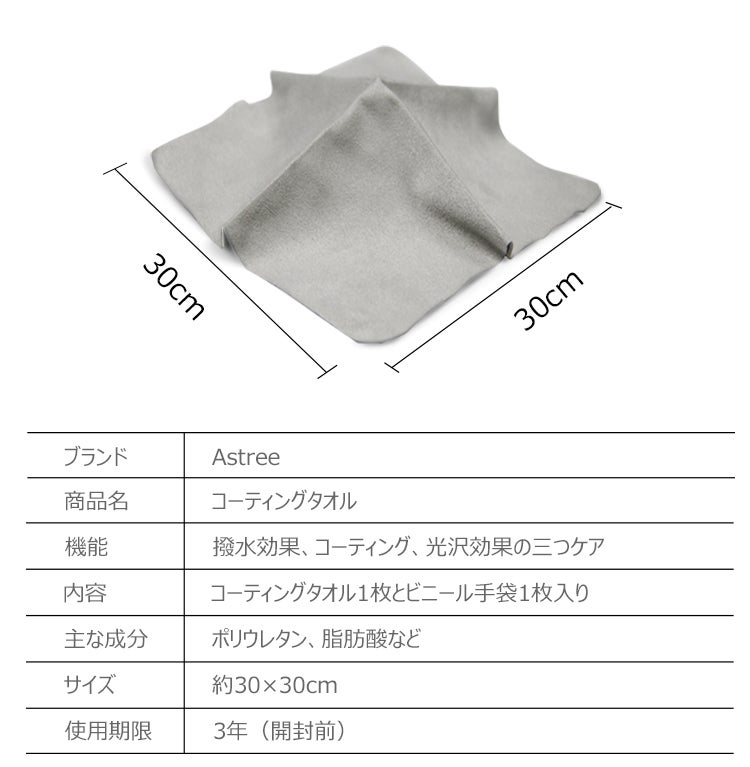 A:一枚のコーティングタオルにつき、通常のハッチバック車1~4台を目安にご使用下さい。コーティングタオルを干さないよう使用後に密閉袋に保管して下さい。