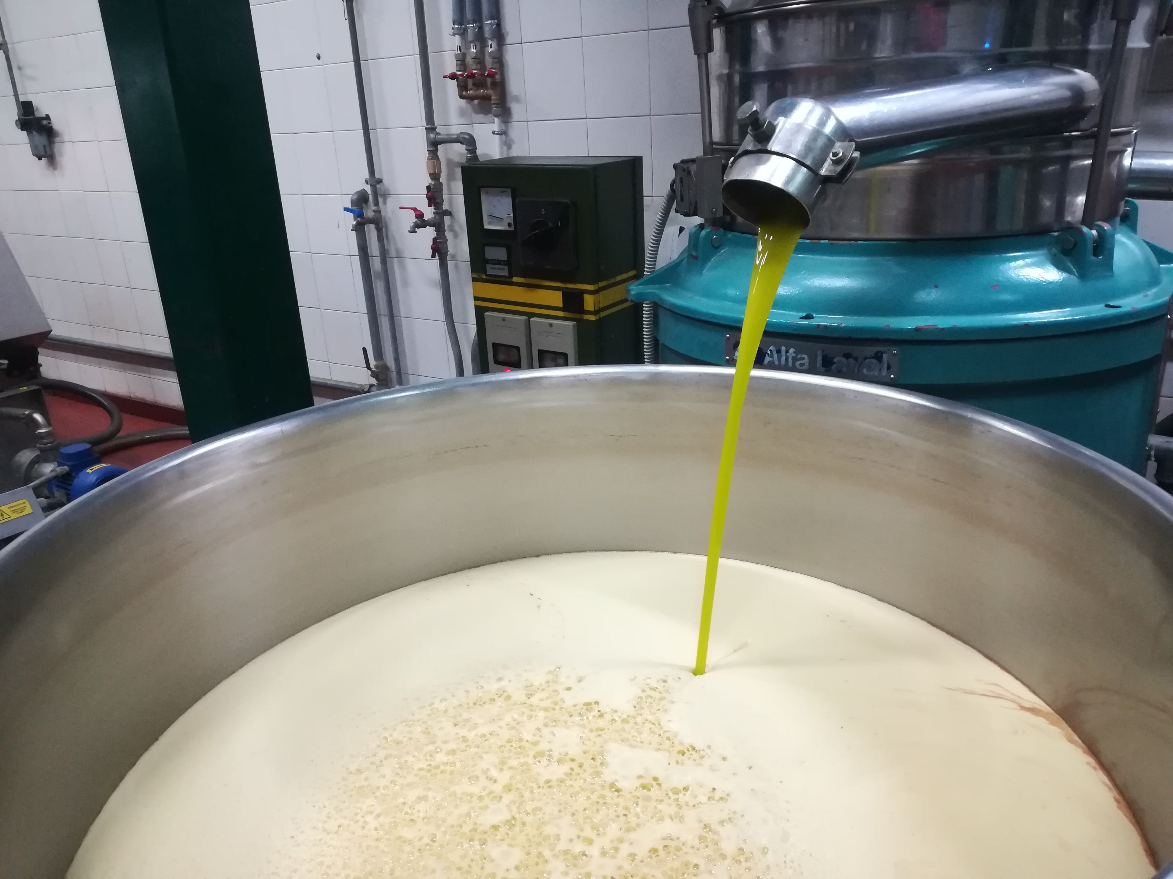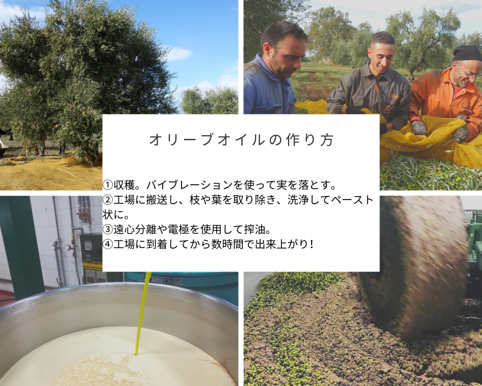 収穫後、オリーブオイル工場に輸送し、そのままペーストになり、数時間後にはオリーブオイルになります。少し保管時間を作ってから、ボトルに詰めていきます。