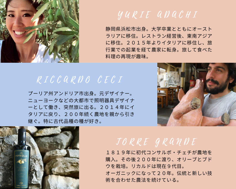 はじめまして。南イタリアのプーリア州アンドリア市でオーガニック農家を経営するTorre Grande社の足立友里絵(あだちゆりえ)と申します。このページをご覧いただきありがとうございます!パートナーのリカルドと夏はワイン用ブドウ、冬はオリーブオイルを作っています。