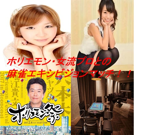 初めまして!!ホリエモン祭り麻雀運営委員のHIU宮本と申します。この度、麻雀大会開催前のエキシビションマッチをRTD(http://www.rtd.co.jp/)にて、行うことになりました。水瀬ちひろさん、上野あいみさんと、堀江貴文氏と同卓できるプレミアムシートの募集になります。麻雀が大好きだという方のご応募をお待ちしております。