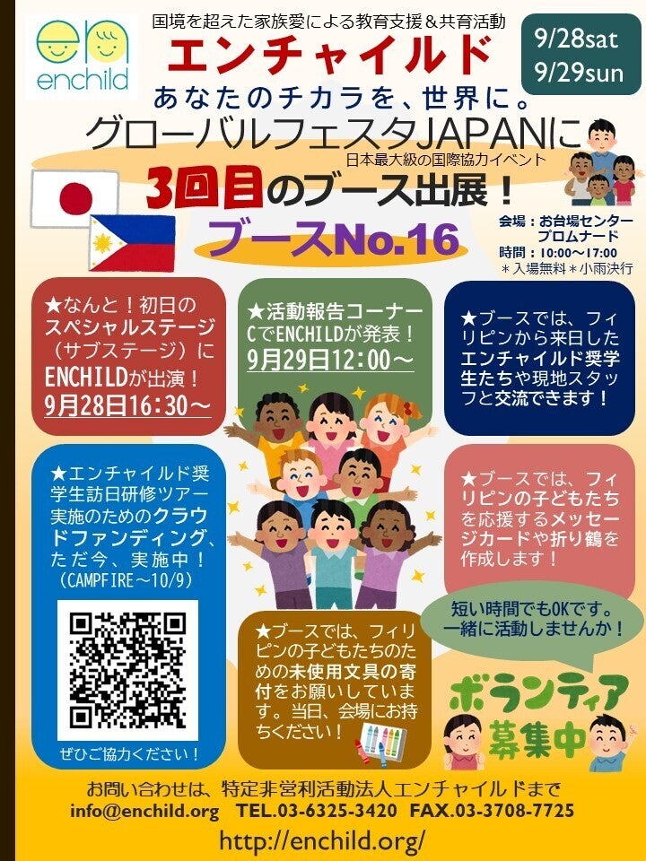 皆さま、ぜひ「グローバルフェスタJAPAN2019」にご来場ください。そして、ブース(小間)ナンバー16番、エンチャイルドの出展ブースをお訪ねください。