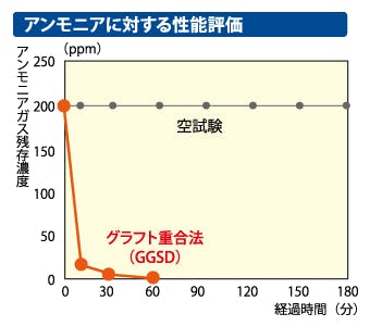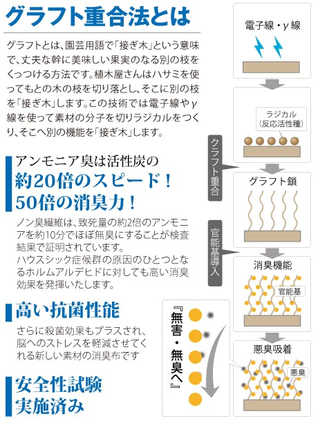 特殊加工により消臭剤を含ませた糸で織りあげた布は、致死量の約2倍のアンモニアを約10分でほぼ無臭にすることが検査結果で証明されています。