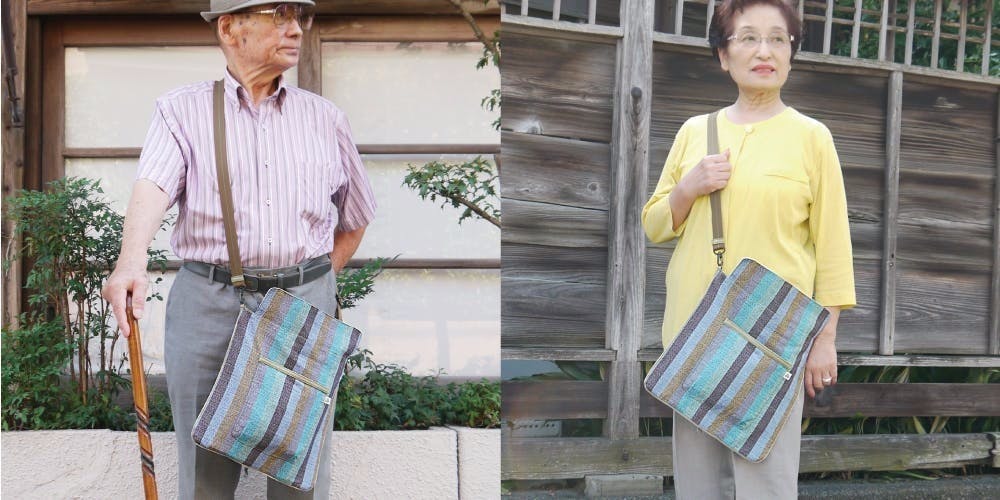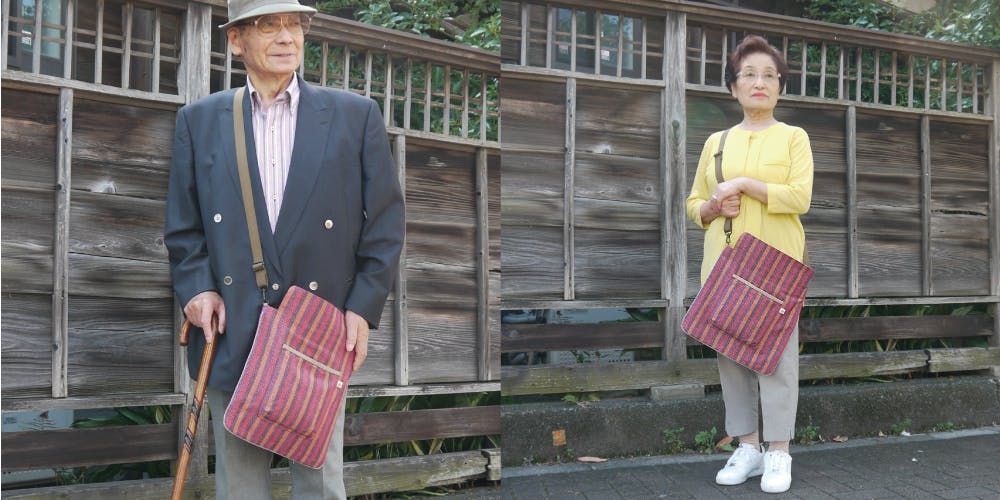 高橋正直さんが、3年ほど前に当工房を訪ねてくださり、ウロバッグカバーをオーダーしてくださったご本人です。高橋さんは、胃がんや甲状腺がんなど、いくつかのご病気を患われたのをきっかけに、数年前から排尿障害に。とっても気丈かつおしゃれな方で、いつも様々な場所へ颯爽とお出かけされています。そこで、気軽に使えて見た目にも良いカバーが欲しいというオーダーでした。いつもおしゃれな高橋さんに合わせ、同時に使いやすさにも考慮してできたのが、このウロバッグカバーなのです。