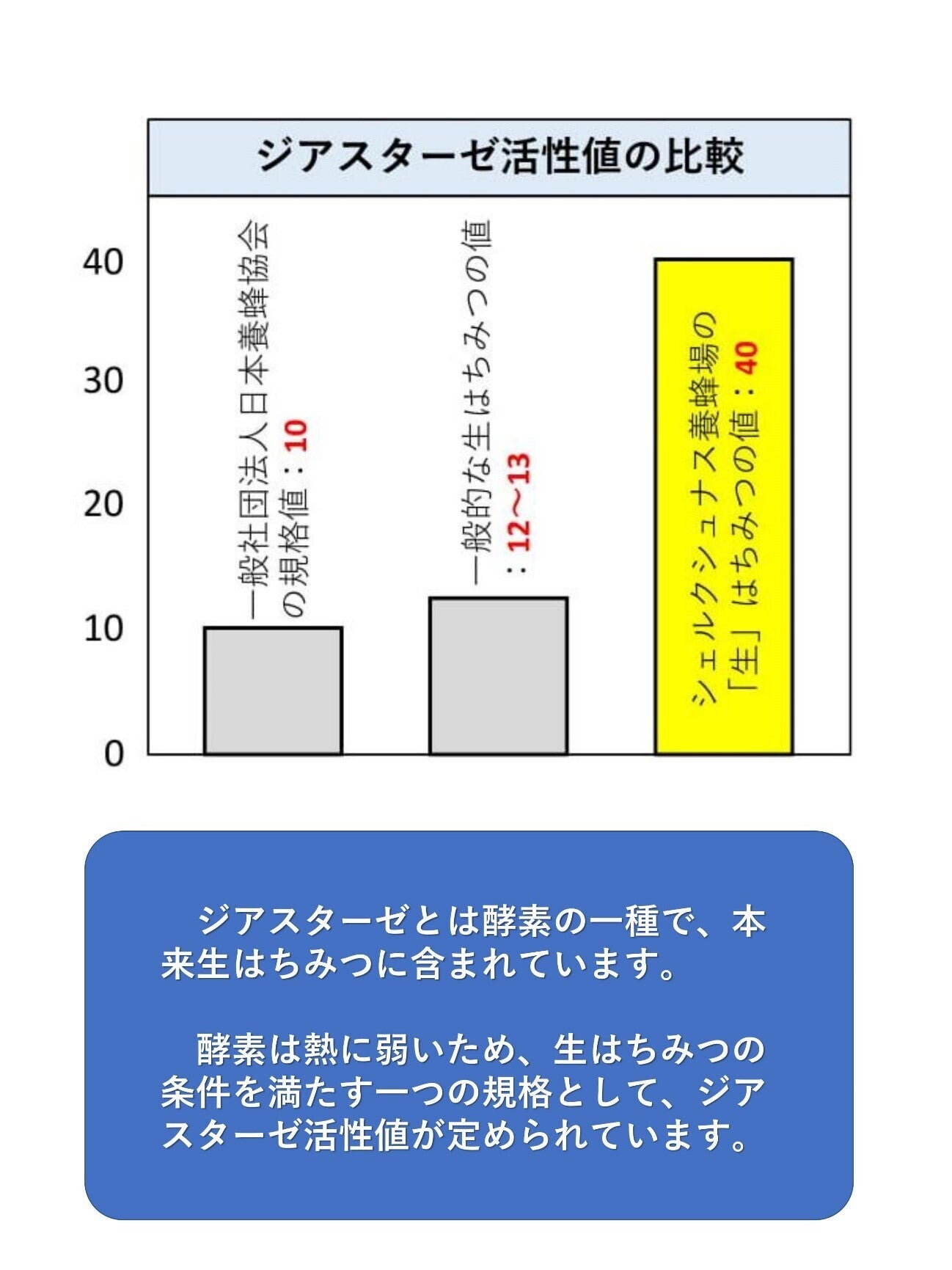 シェルクシュナス養蜂場のジアスターゼ活性値の最高値*は、その4倍にあたる40です。一般的な生はちみつのジアスターゼ活性値が12~13程度ですので、シェルクシュナス養蜂場の「生」はちみつは、品質の高い生はちみつの中でも文字通り群を抜いています。