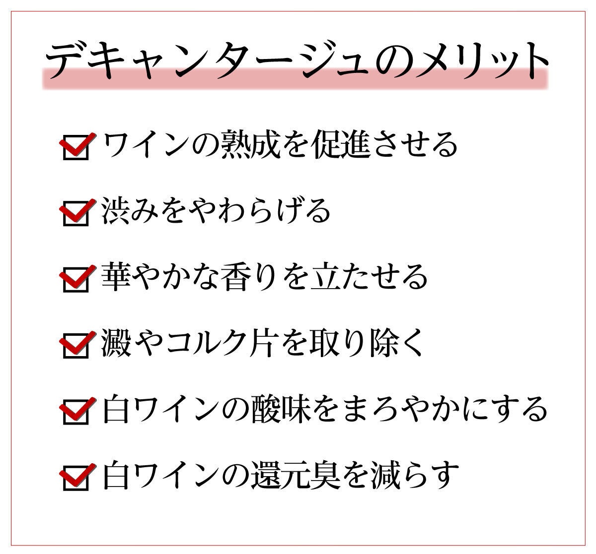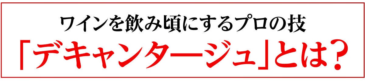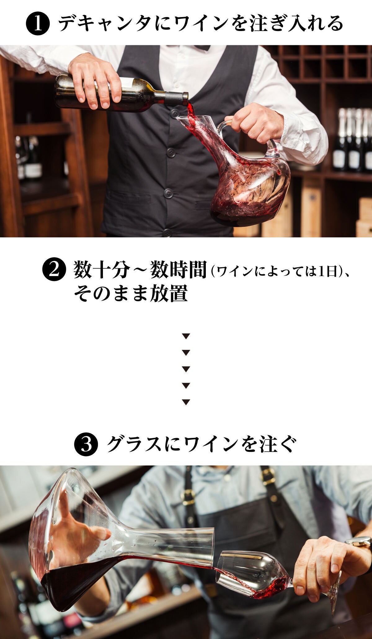 デキャンタと呼ばれるガラス製の大きな容器にワインを注ぎ入れ、数十分から数時間(場合によっては翌日まで)放置することで、ワインの熟成を促進させ、飲み頃に近づけます。