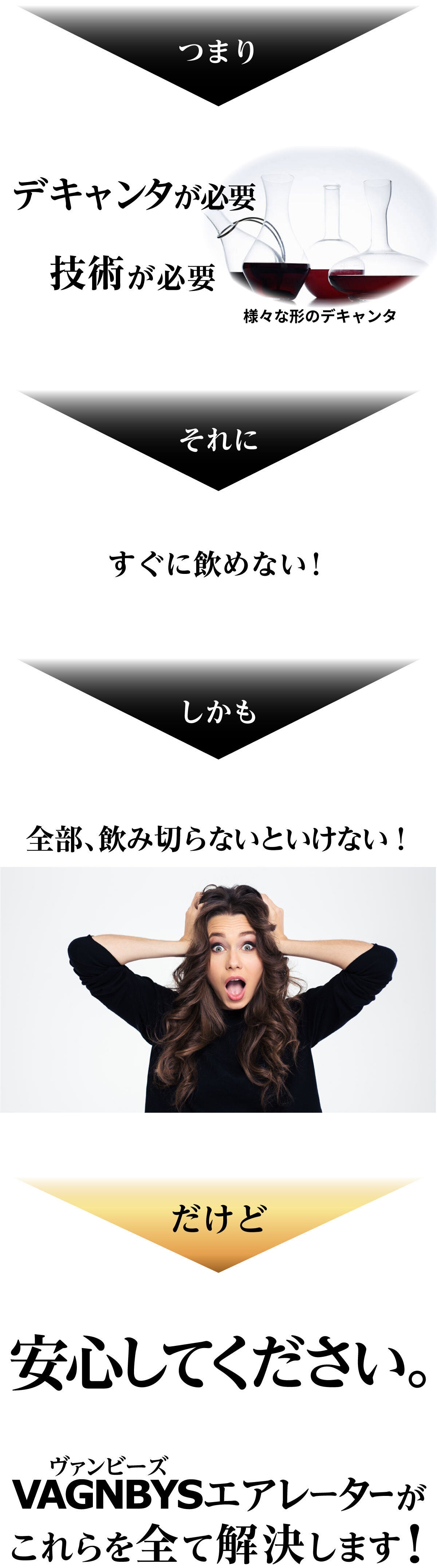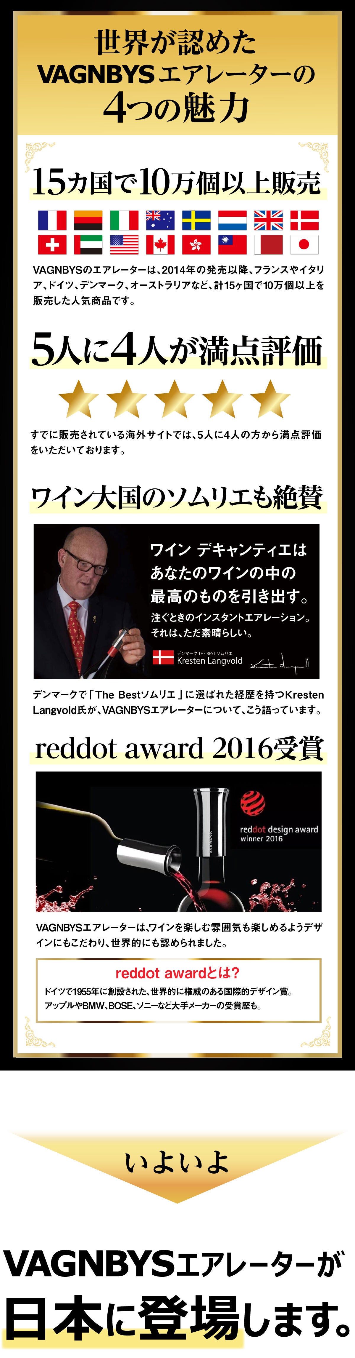 弊社の狙いは、ワインを提供したり飲んだりする際に起りえる問題を解消する、いいエアレーターを開発する事でした。